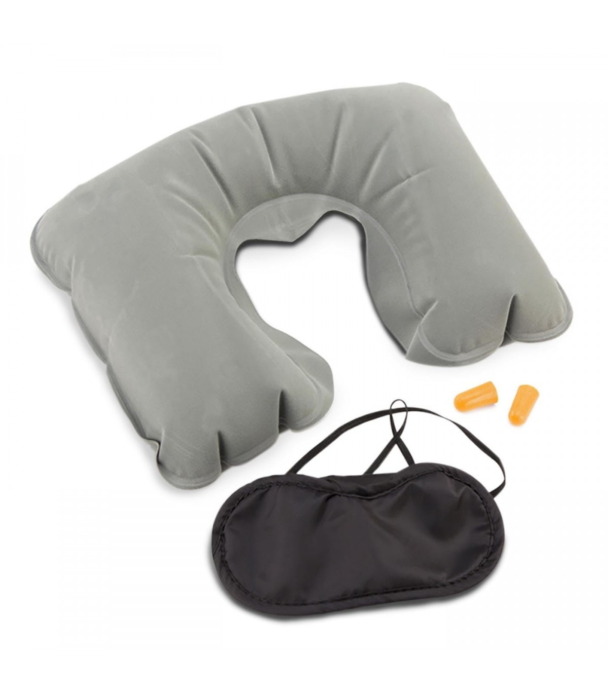 Prepárate para un viaje cómodo y sin preocupaciones con nuestro set de viaje de 3 accesorios imprescindibles. Este conjunto incluye una mascarilla de suave microfibra en elegante color negro, una almohadilla inflable para el cuello y tapones en material EVA de color naranja para un máximo confort y conveniencia.