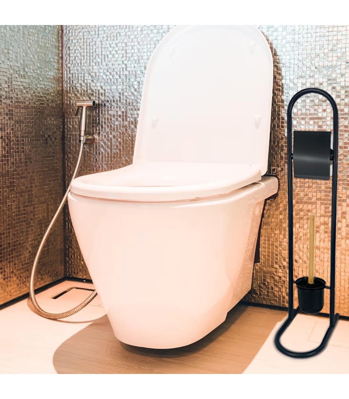 Mantén tu baño organizado y con estilo con nuestro portarrollos de metal con escobilla de Bambú. Este práctico y atractivo conjunto es la solución perfecta para mantener tus rollos de papel higiénico al alcance de la mano, mientras añade un toque natural y sofisticado a tu espacio.