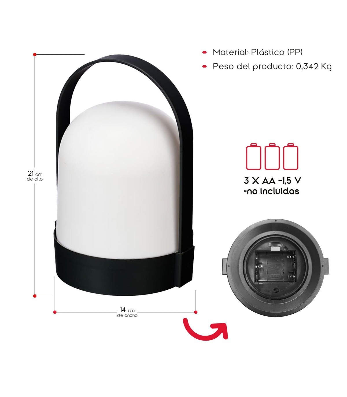 ? FUNCIONA CON PILAS AAA. Equipada para usar con 3 pilas AAA (no incluidas), esta lámpara garantiza máxima movilidad y la libertad de iluminar cualquier rincón sin necesidad de cables.