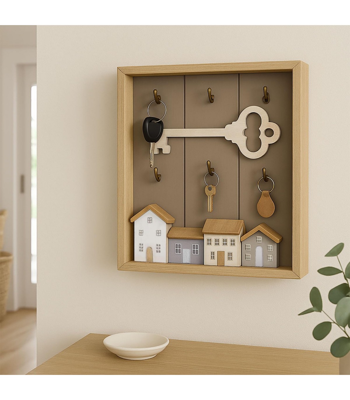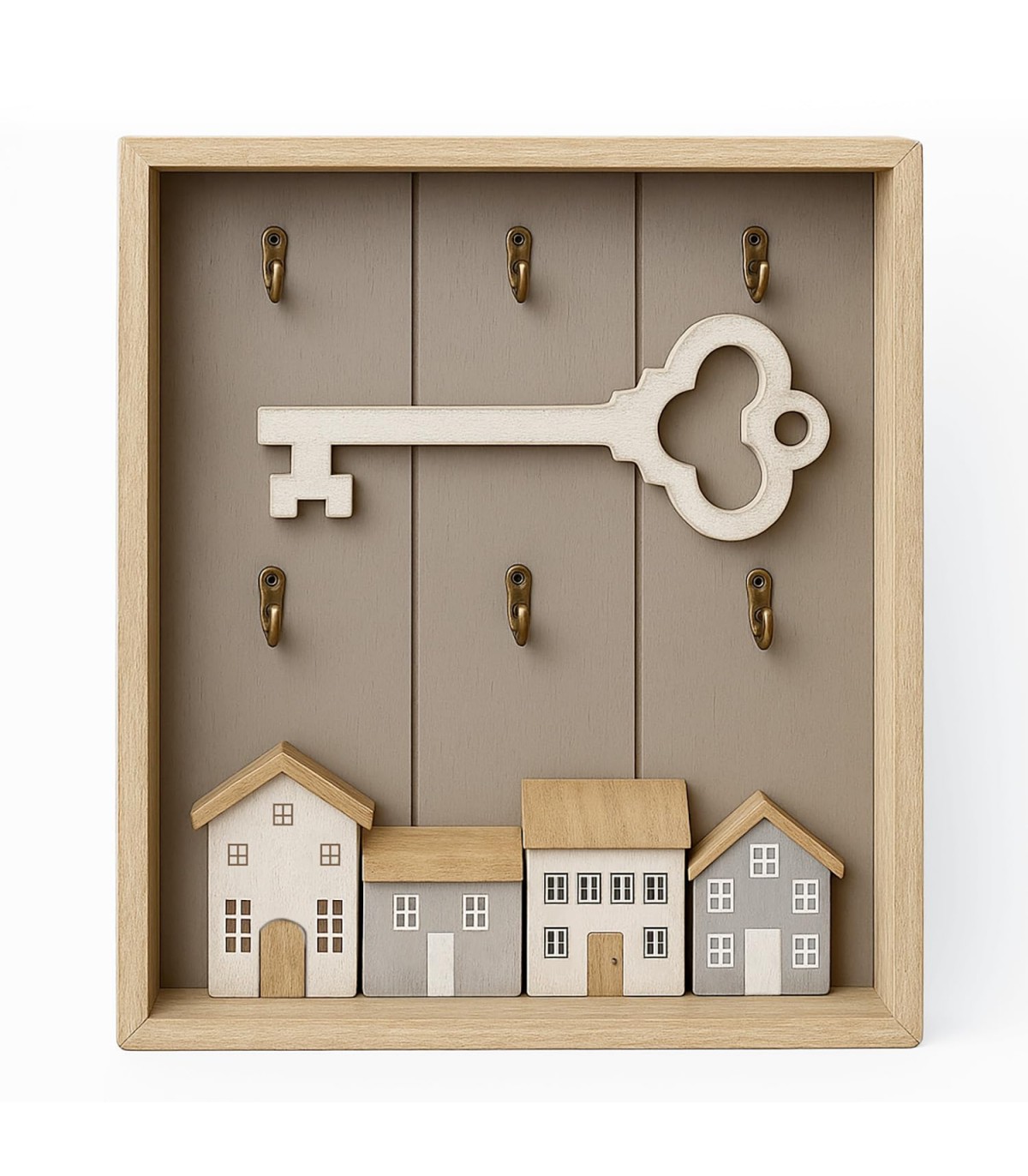 Organiza tu hogar con estilo y funcionalidad gracias al Colgador de Llaves de Pared de TIENDA EURASIA. Dos elegantes colgadores de madera en color natural, diseñados para añadir un toque decorativo y práctico a tu entrada, pasillo o cocina. Con espacio suficiente para varias llaves, sus diseños únicos de casitas y llave, aportan encanto y orden a tu día a día.