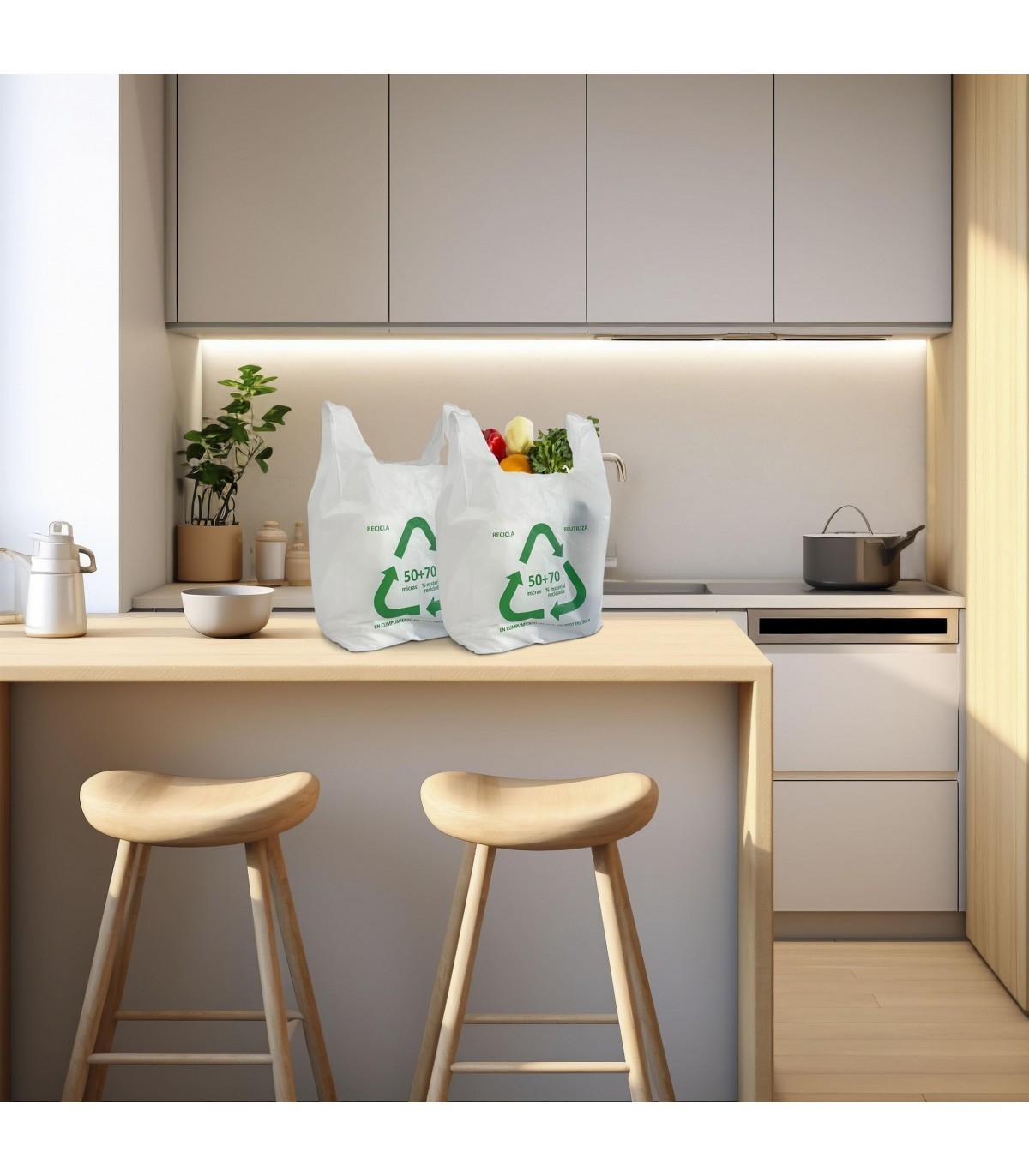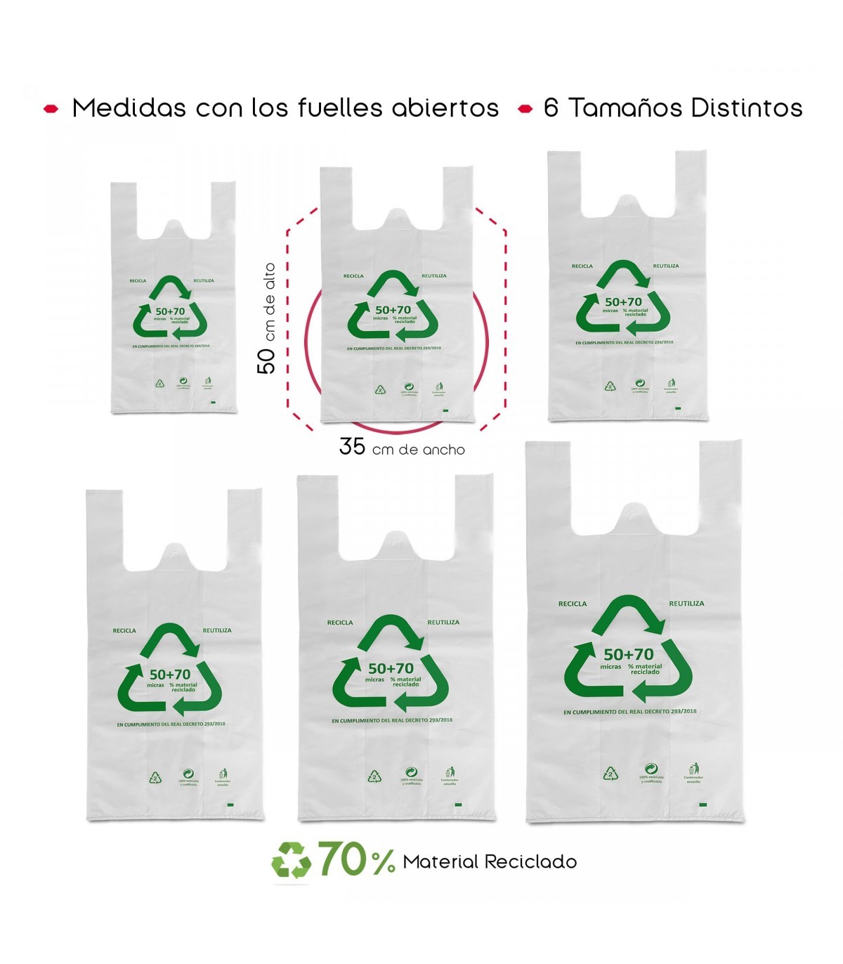 Descubre la funcionalidad con nuestra bolsa tipo camiseta en blanco, una elección ecoamigable con un 70% de material plástico reciclado. Su diseño incluye fuelles abiertos que facilitan el acceso y garantizan la capacidad en 6 distintos tamaños, desde 30x40 cm hasta 80x85 cm. Ideal para cualquier necesidad, esta bolsa es apta para uso alimentario, asegurando la seguridad en tus compras diarias. Su durabilidad y capacidad de reutilización hacen de esta bolsa una opción resistente y sostenible para tu estilo de vida.