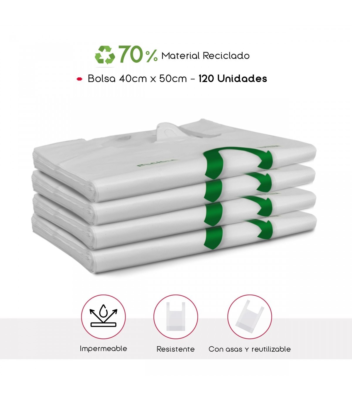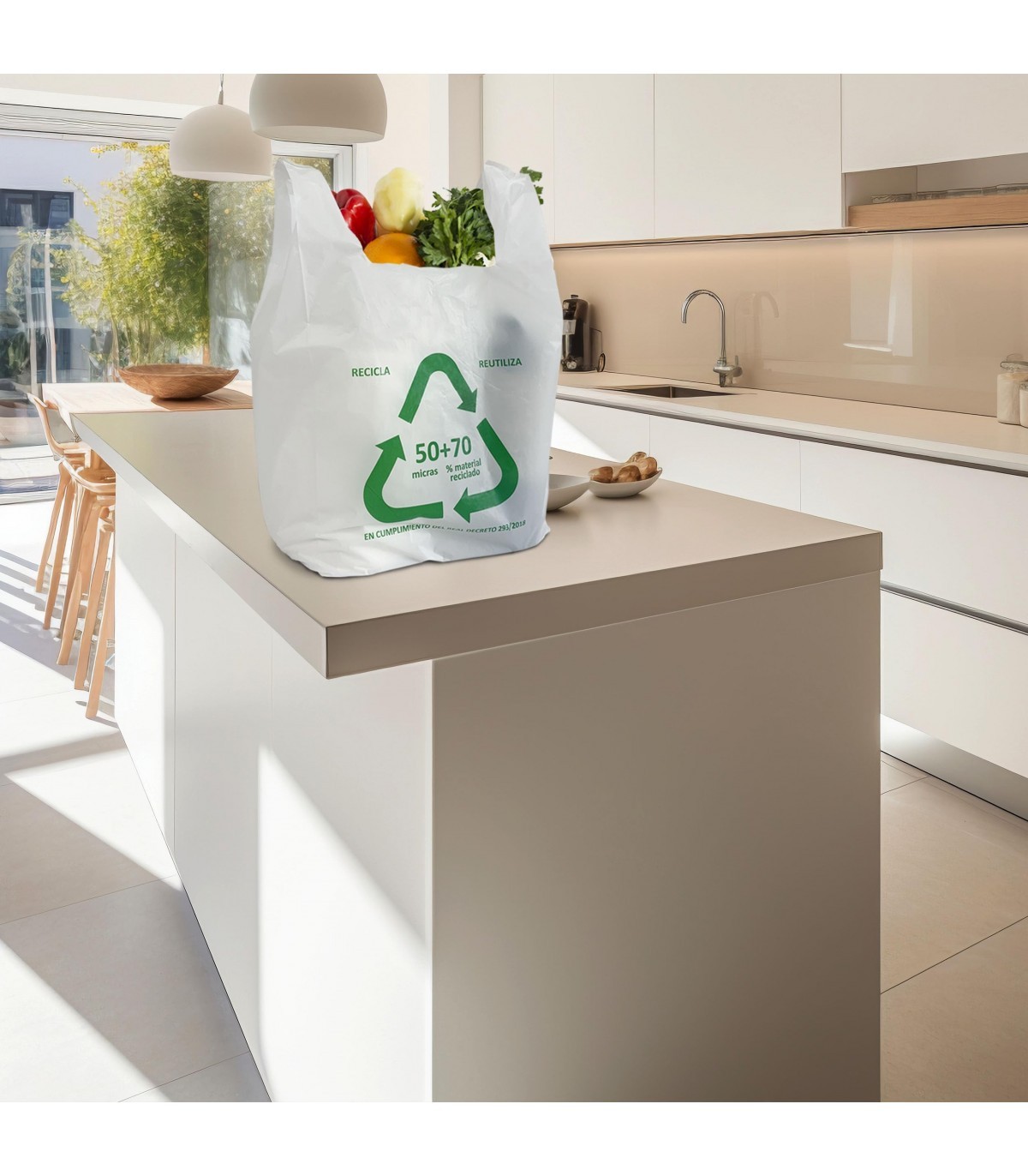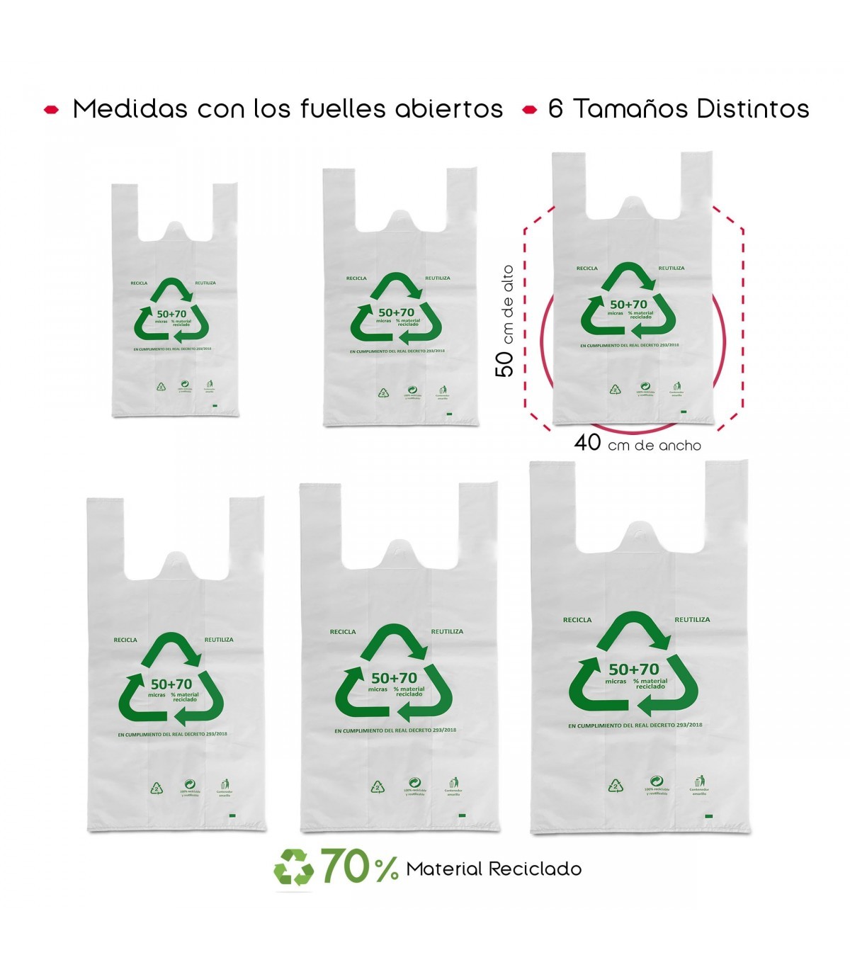 Descubre la funcionalidad con nuestra bolsa tipo camiseta en blanco, una elección ecoamigable con un 70% de material plástico reciclado. Su diseño incluye fuelles abiertos que facilitan el acceso y garantizan la capacidad en 6 distintos tamaños, desde 30x40 cm hasta 80x85 cm. Ideal para cualquier necesidad, esta bolsa es apta para uso alimentario, asegurando la seguridad en tus compras diarias. Su durabilidad y capacidad de reutilización hacen de esta bolsa una opción resistente y sostenible para tu estilo de vida.