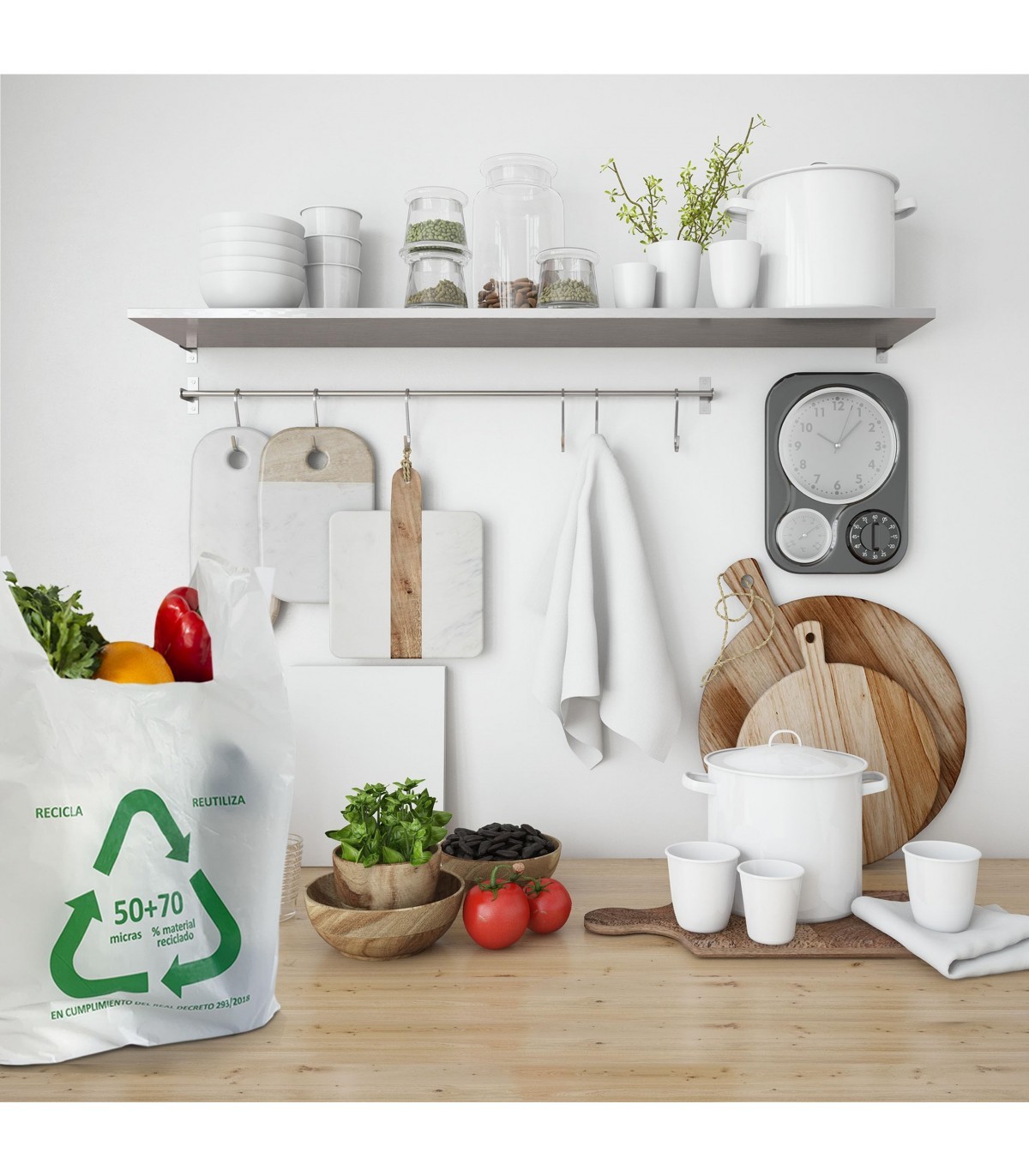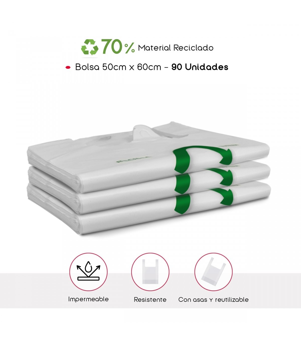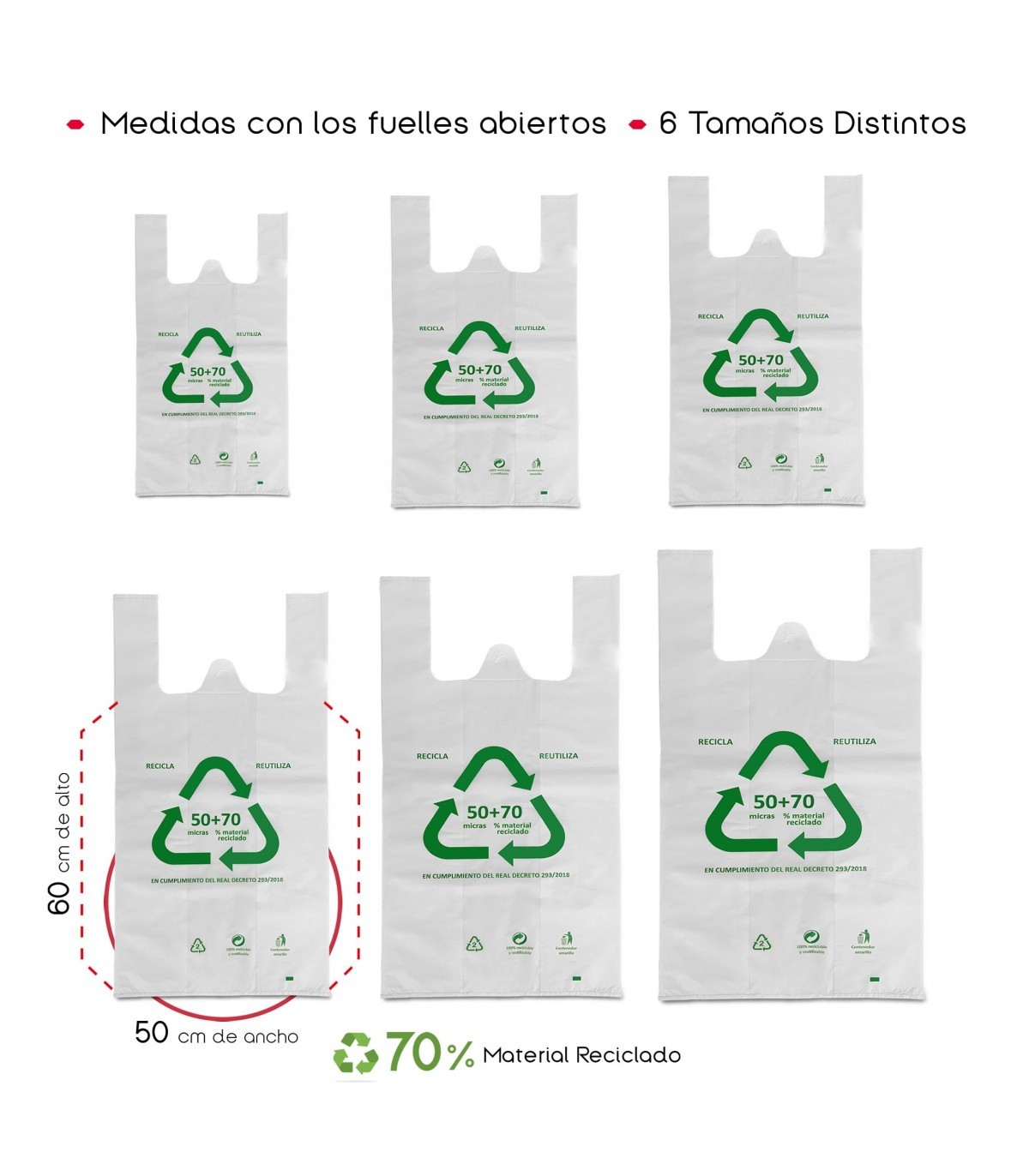 Descubre la funcionalidad con nuestra bolsa tipo camiseta en blanco, una elección ecoamigable con un 70% de material plástico reciclado. Su diseño incluye fuelles abiertos que facilitan el acceso y garantizan la capacidad en 6 distintos tamaños, desde 30x40 cm hasta 80x85 cm. Ideal para cualquier necesidad, esta bolsa es apta para uso alimentario, asegurando la seguridad en tus compras diarias. Su durabilidad y capacidad de reutilización hacen de esta bolsa una opción resistente y sostenible para tu estilo de vida.
