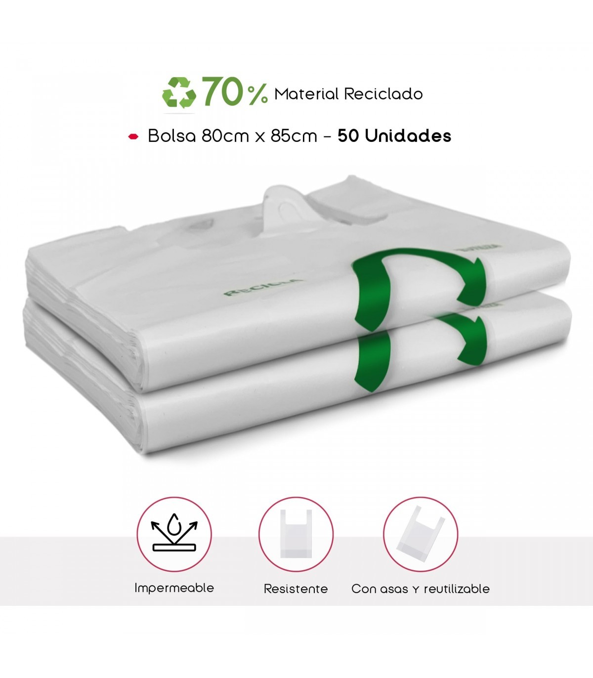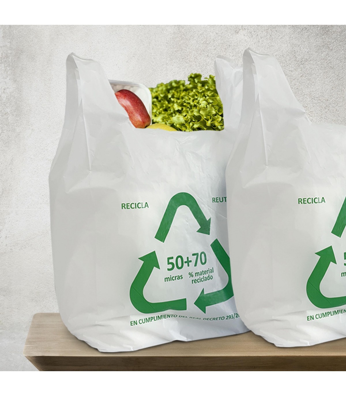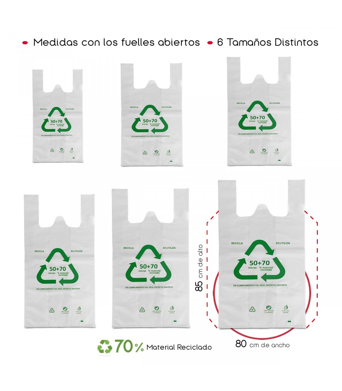 Descubre la funcionalidad con nuestra bolsa tipo camiseta en blanco, una elección ecoamigable con un 70% de material plástico reciclado. Su diseño incluye fuelles abiertos que facilitan el acceso y garantizan la capacidad en 6 distintos tamaños, desde 30x40 cm hasta 80x85 cm. Ideal para cualquier necesidad, esta bolsa es apta para uso alimentario, asegurando la seguridad en tus compras diarias. Su durabilidad y capacidad de reutilización hacen de esta bolsa una opción resistente y sostenible para tu estilo de vida.