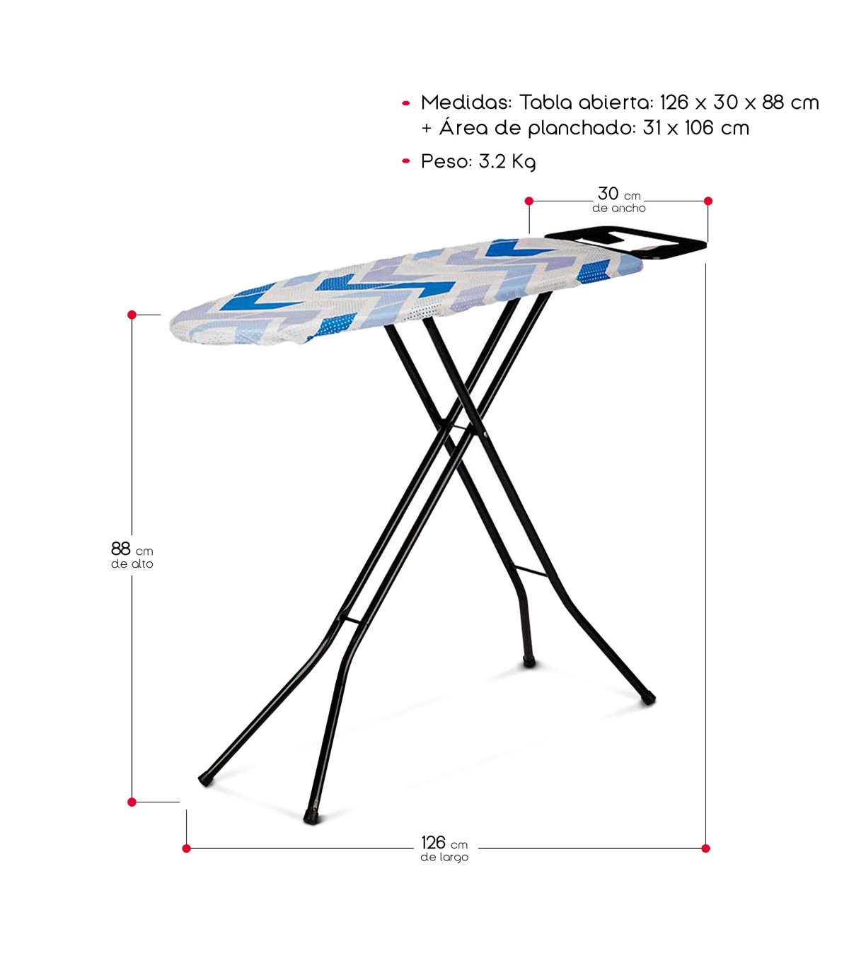 AMPLIA ÁREA DE PLANCHADO: Con unas medidas de 126x30x88 cm y un área de planchado de 31x106 cm, ofrece suficiente espacio para todo tipo de prendas.