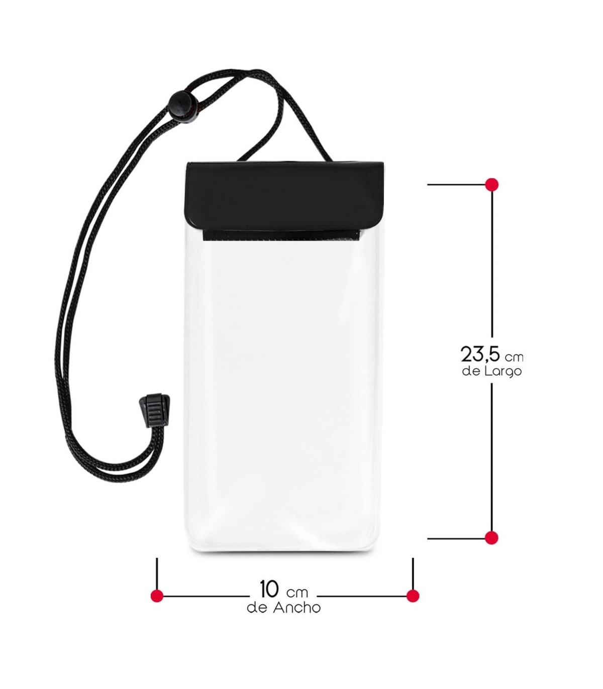 Nuestra funda impermeable está diseñada para adaptarse a la mayoría de los teléfonos inteligentes del mercado, con unas dimensiones de 10x23,5 cm. Su diseño transparente te permite acceder fácilmente a la pantalla táctil y utilizar todas las funciones de tu teléfono, incluida la cámara, sin necesidad de sacarlo de la funda.