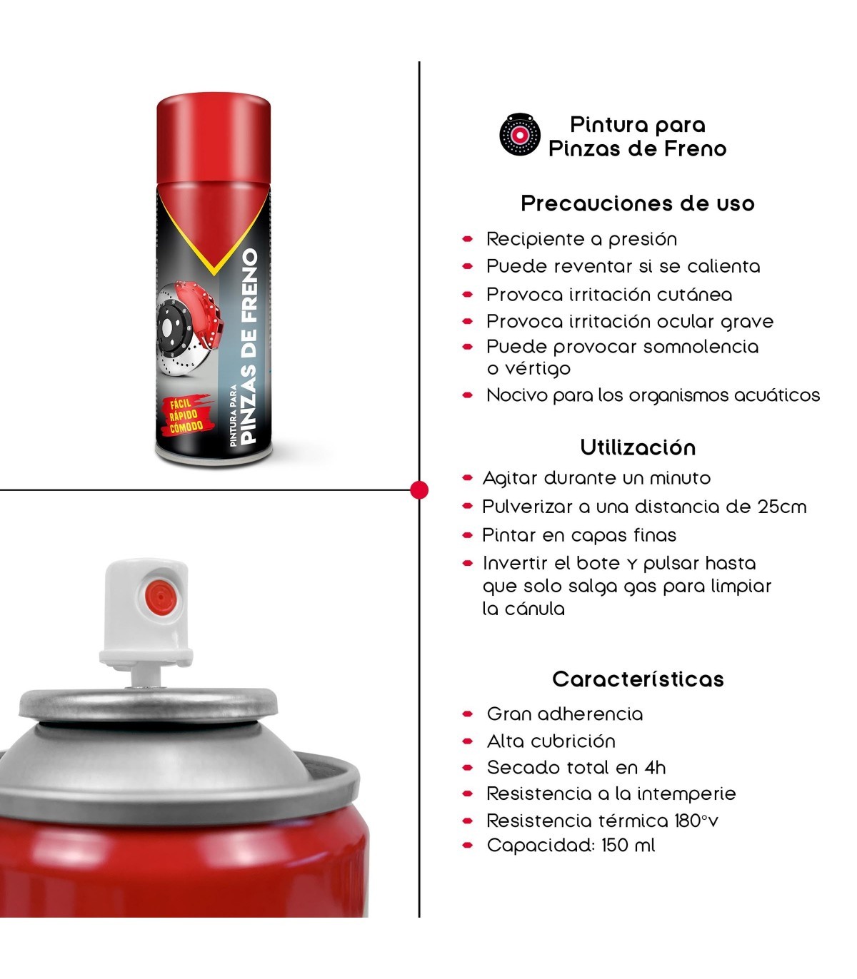 ? RENOVACIÓN Y PROTECCIÓN: Este spray de pintura para pinzas de freno está diseñado para cubrir y proteger tus discos, pinzas y pastillas, proporcionando un acabado duradero y resistente a la corrosión.