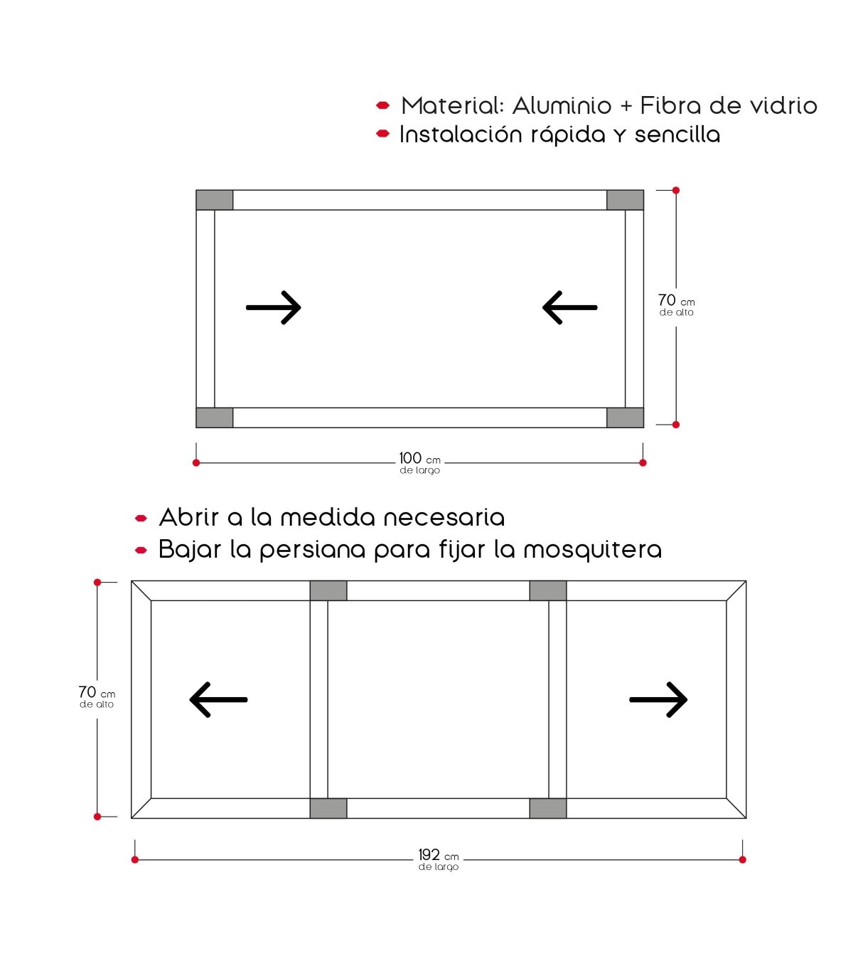 ? EXTENSIBLE Y ADAPTABLE: Disponible en dos tamaños extensibles (70 a 132 cm y 100 a 192 cm de longitud), esta mosquitera se ajusta perfectamente a diferentes tamaños de ventanas, ofreciendo versatilidad y comodidad.