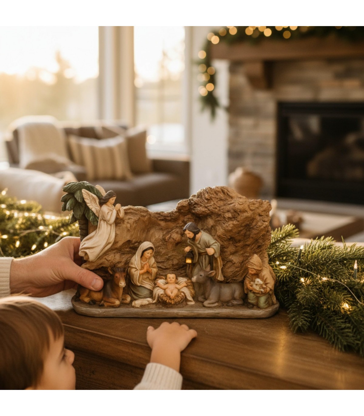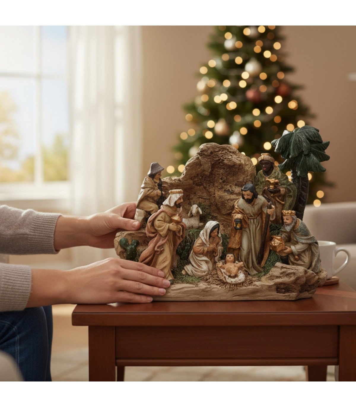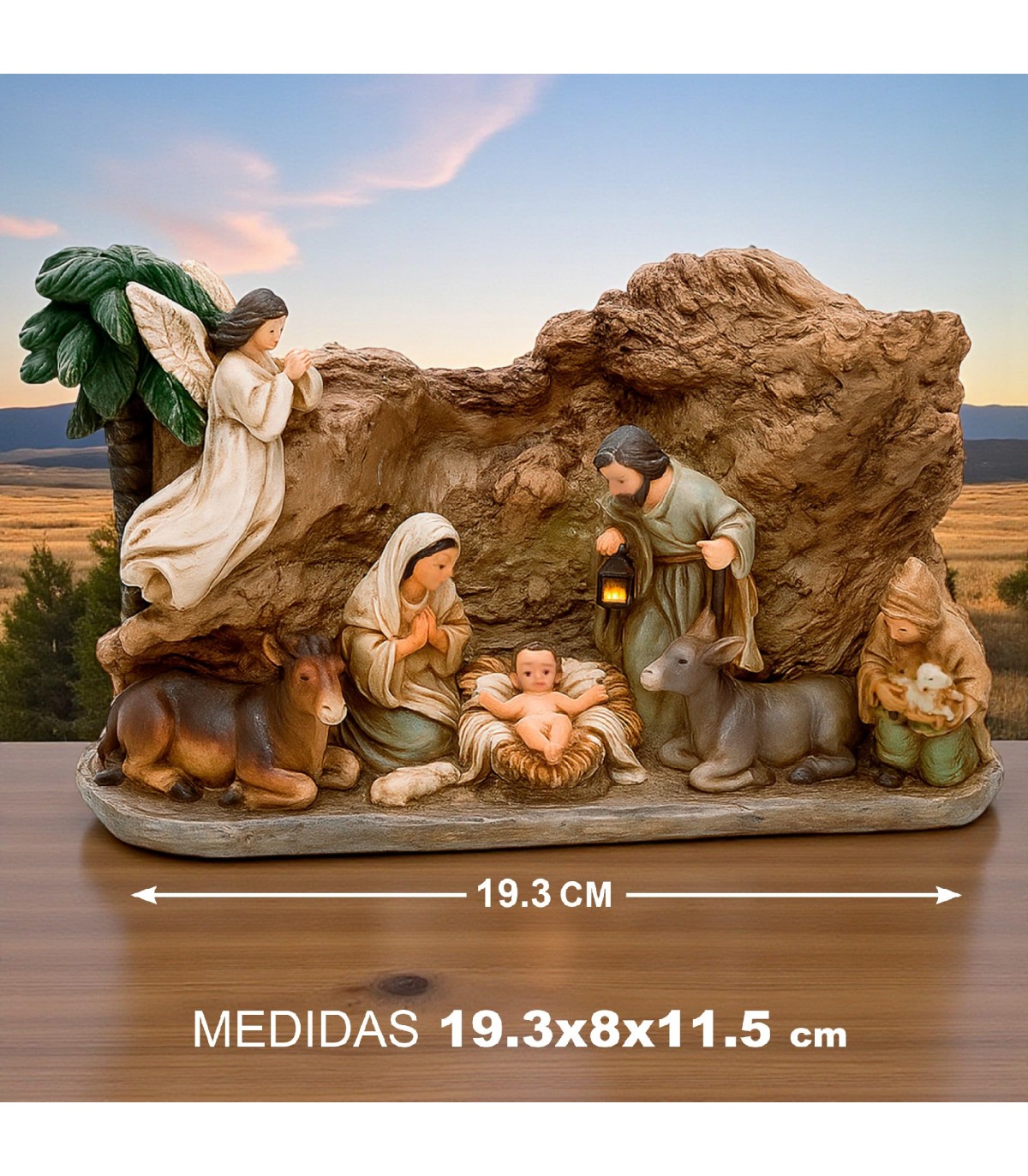 AMBIENTADO EN UNA CUEVA CLÁSICA. Su diseño tridimensional y realista recrea la atmósfera cálida del pesebre original, ideal para destacar en el salón, el recibidor o junto al árbol de Navidad.