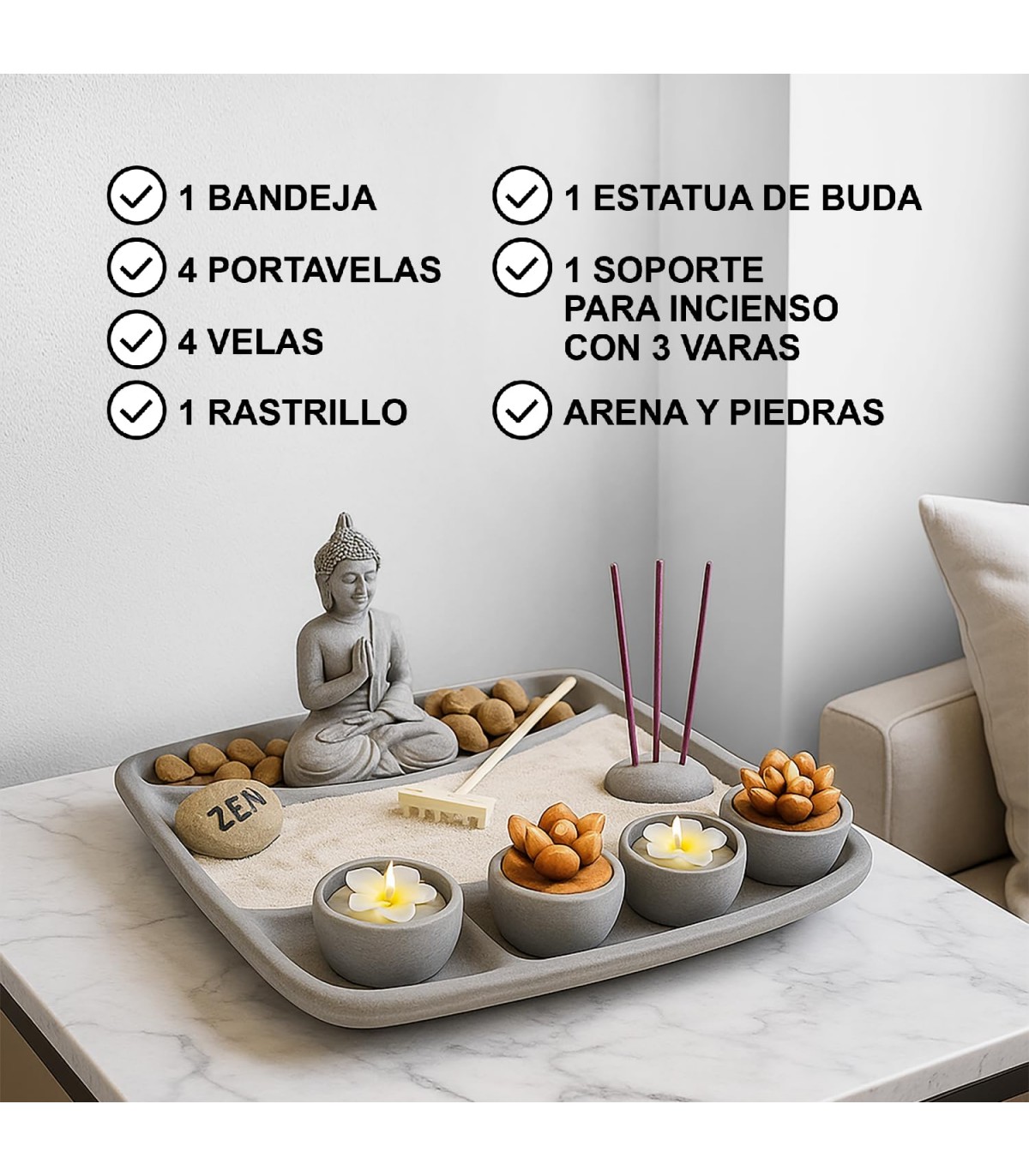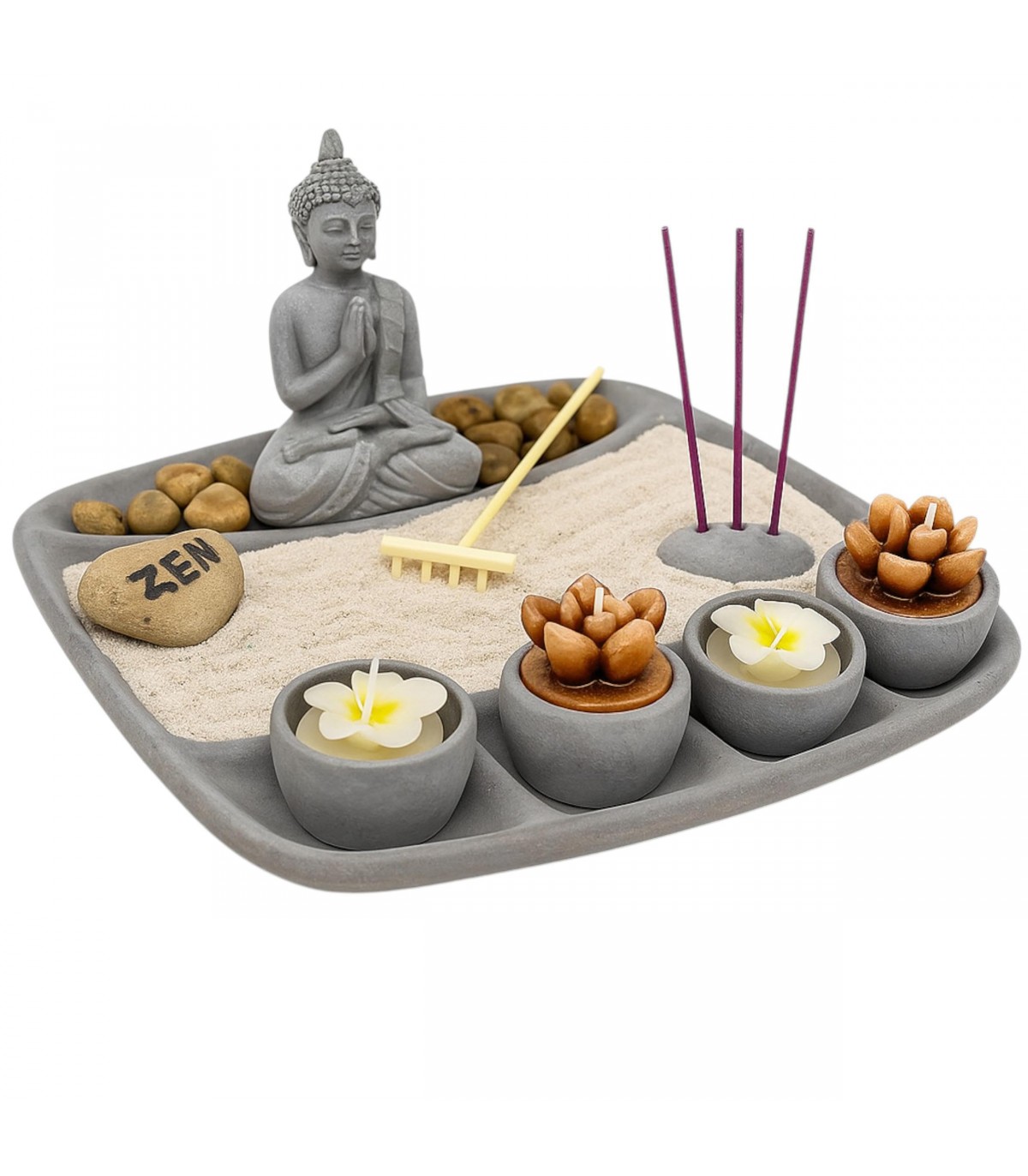 SET COMPLETO PARA RELAJACIÓN. Incluye una bandeja de cemento, una estatua de Buda, portavelas con 4 velas, un rastrillo, soporte para incienso con 3 varas, arena y piedras, todo lo necesario para una experiencia zen.