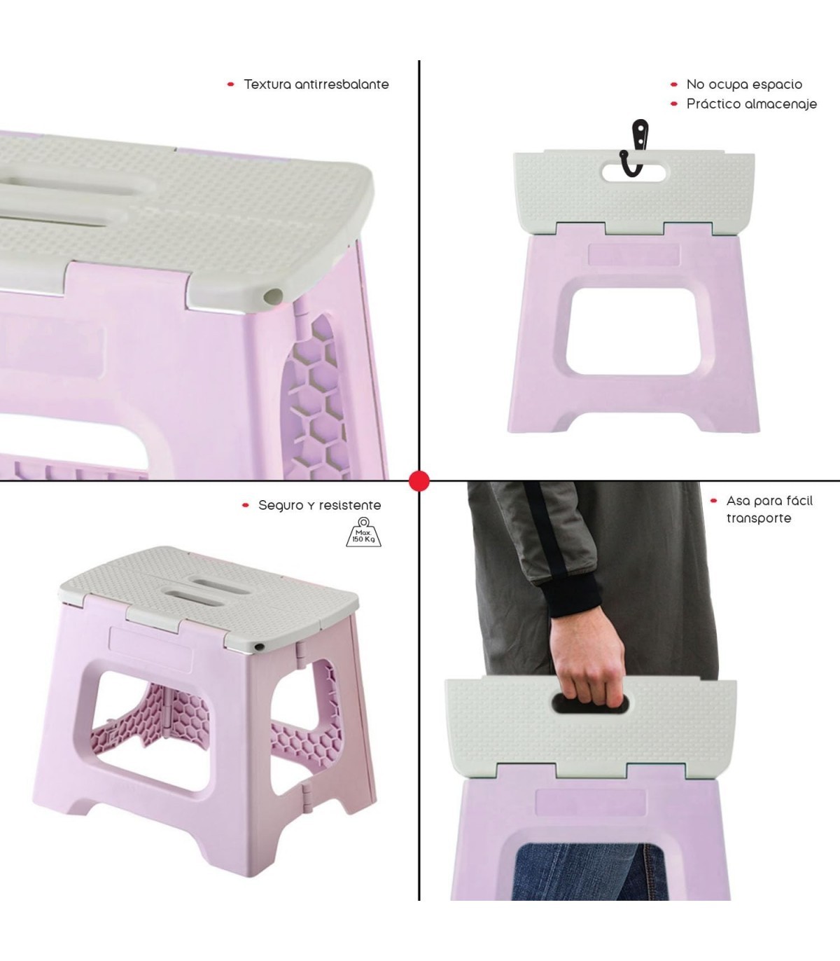 ? PLEGABLE Y PORTÁTIL: Diseñado para la conveniencia, este taburete se pliega fácilmente para un almacenamiento compacto y cuenta con asas internas que facilitan su transporte, lo que lo convierte en el compañero perfecto para interiores y exteriores.