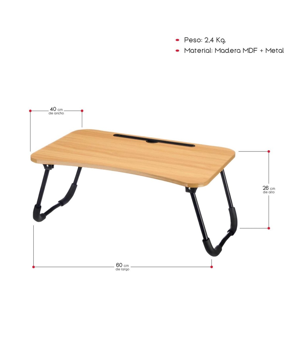 ? SUPERFICIE AMPLIA Y FUNCIONAL. Con medidas de 60x40x26 cm, esta mesa ofrece el espacio ideal para portátiles, tablets y otros accesorios esenciales.