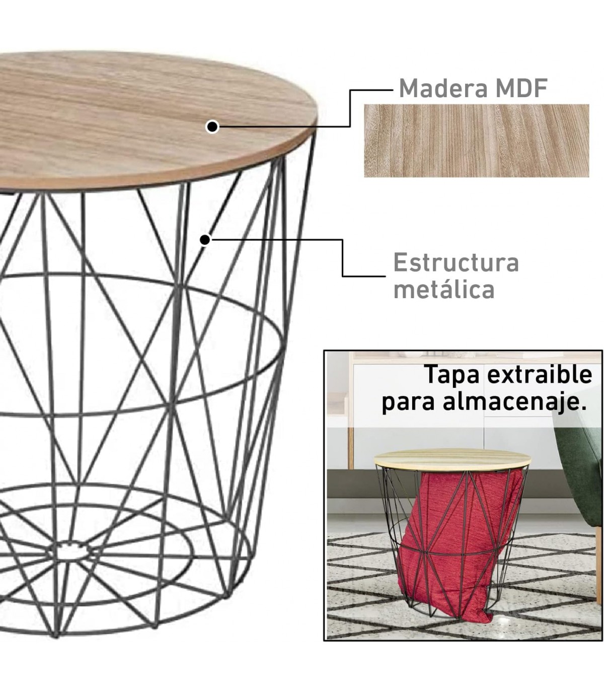 DISEÑO MODERNO Y VERSÁTIL: Con una estructura de rejilla metálica y tapa de madera MDF, estas mesas combinan elegancia y funcionalidad, adaptándose a cualquier estilo de decoración.