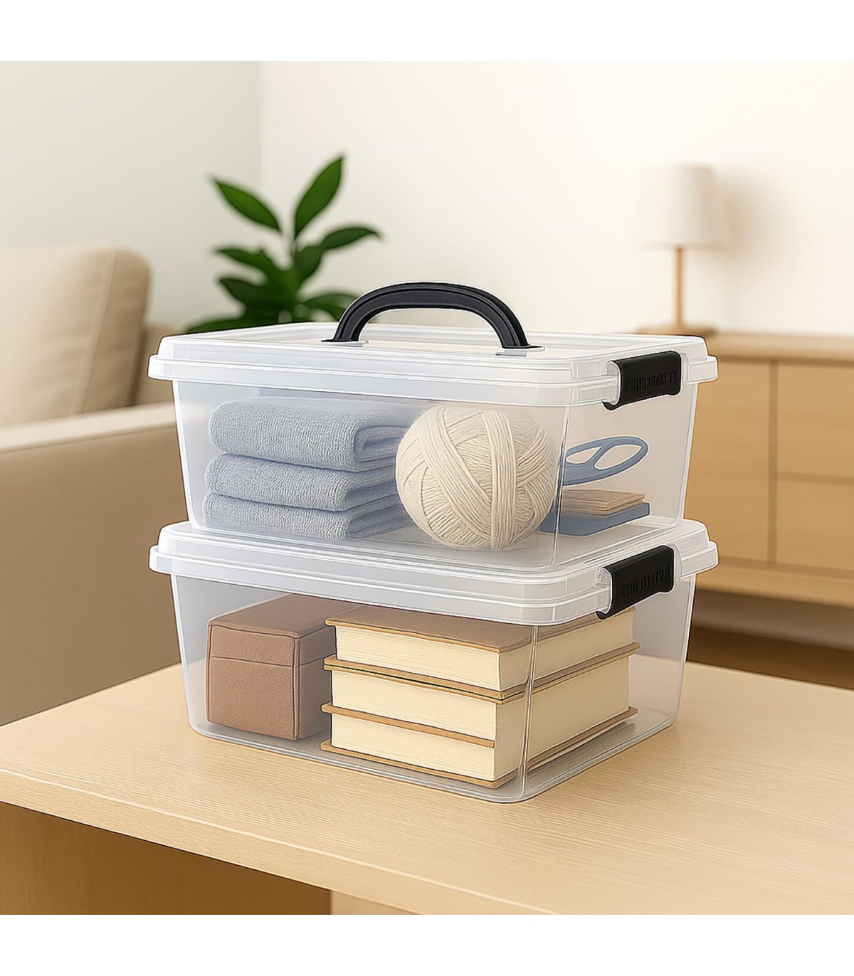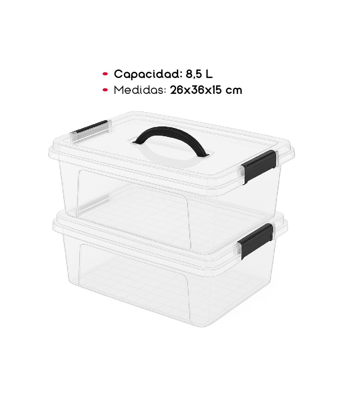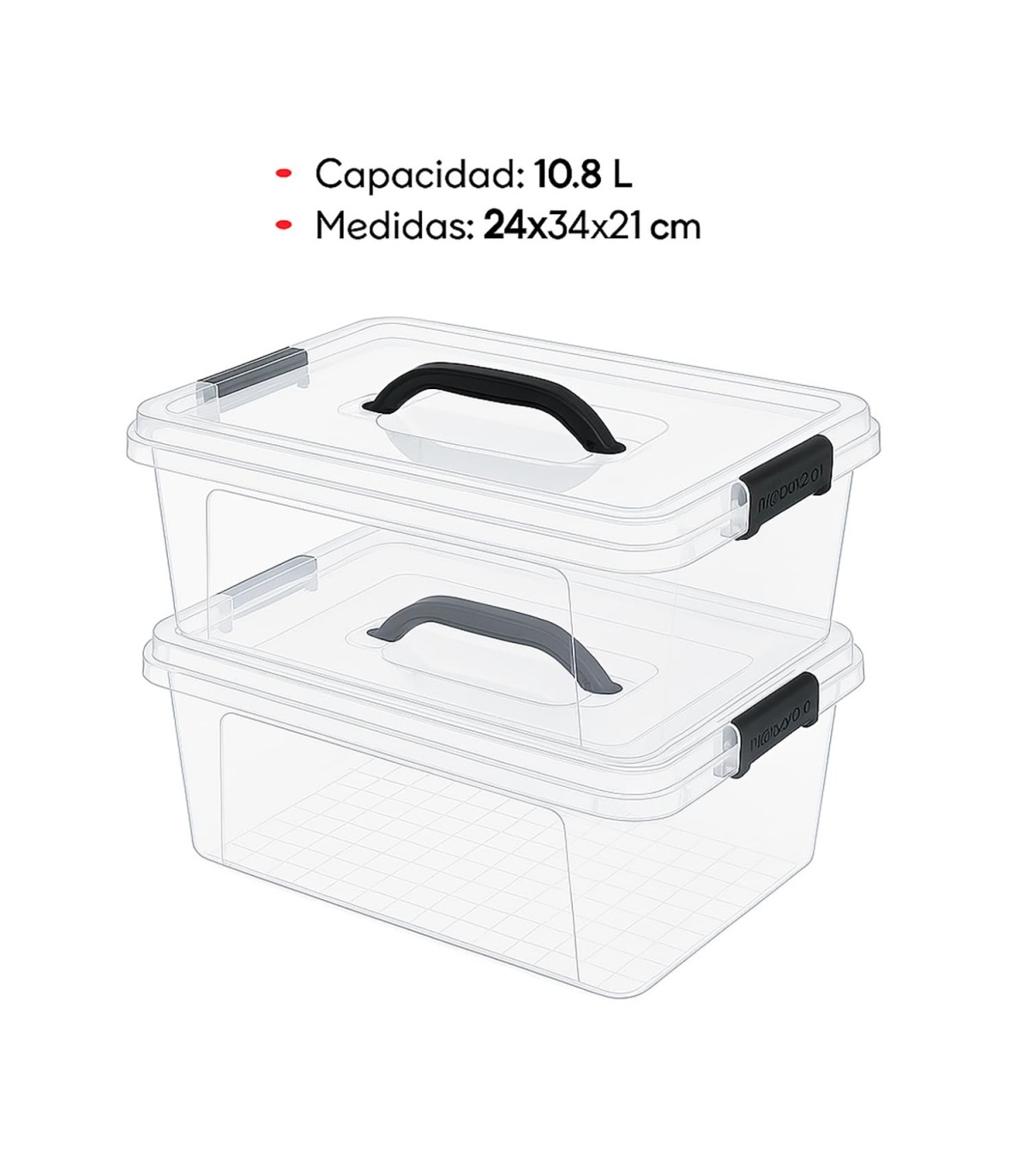Transforma el orden en tu hogar, oficina o almacén con el Pack de 2 Cajas de Almacenaje de TIENDA EURASIA, elaboradas en resistente plástico PP transparente. Su diseño funcional con cierres herméticos a presión en azul, permite identificar fácilmente el contenido y mantenerlo protegido. Disponibles en múltiples capacidades y tamaños, son la solución práctica que se adapta a todas tus necesidades.