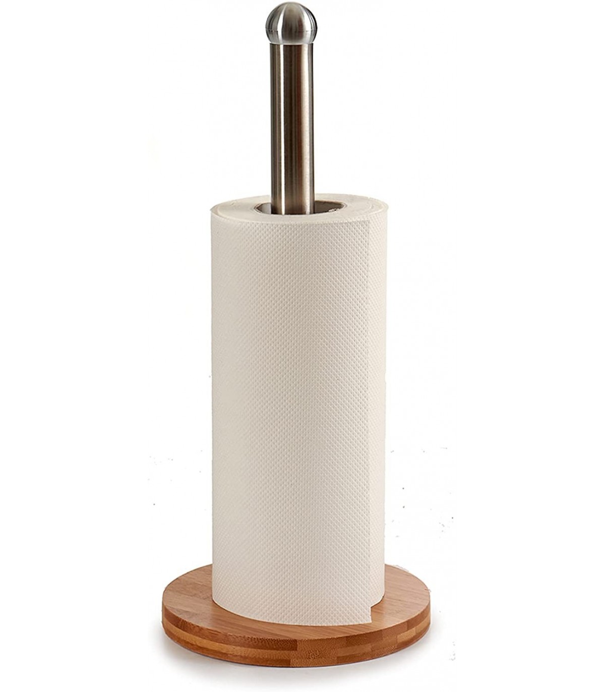 Portarrollos de Cocina - Soporte de Acero Inoxidable y Base de Bambu - Ø15 cm x h 34 cm - XAR24087