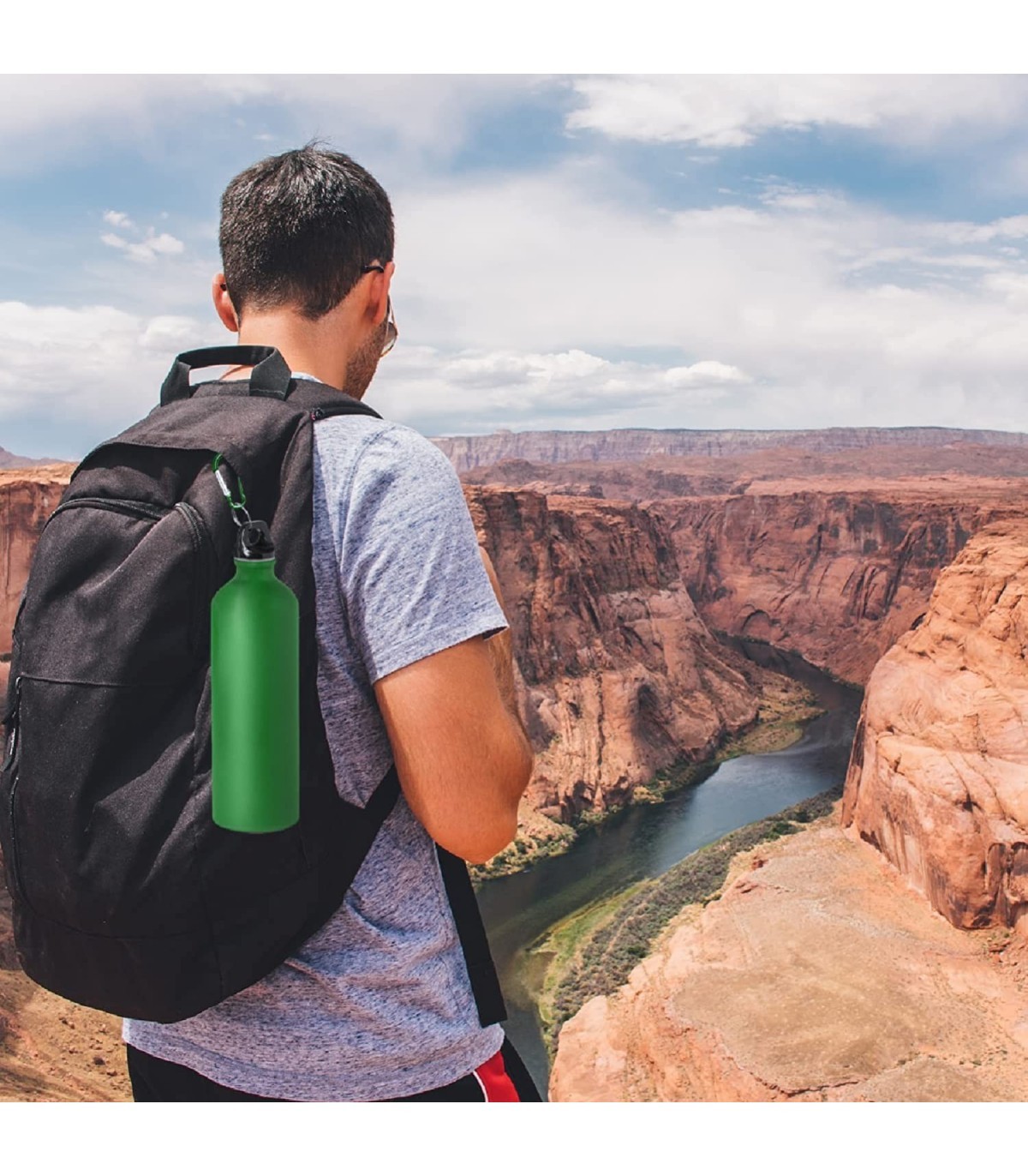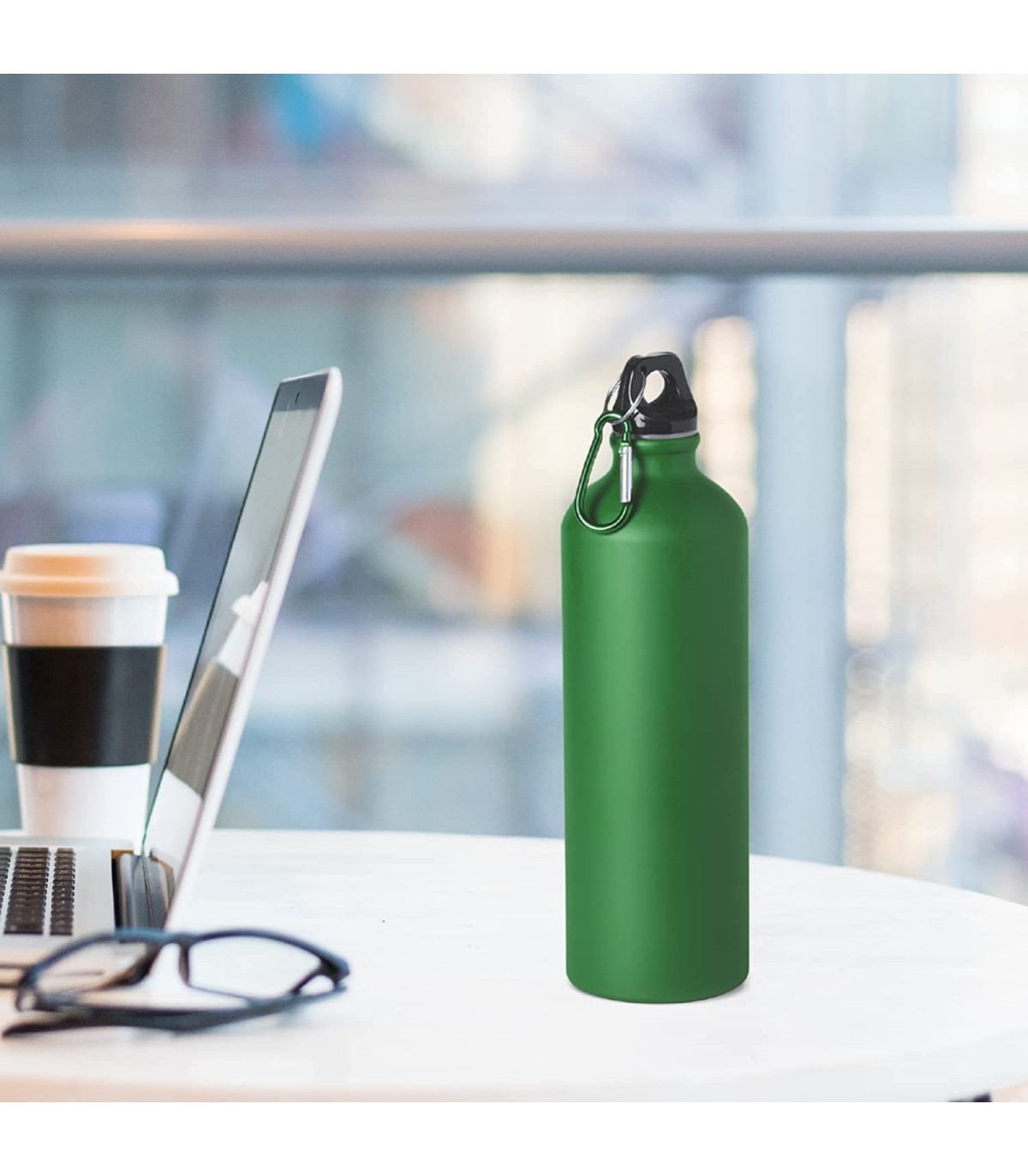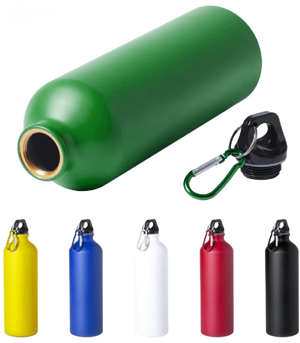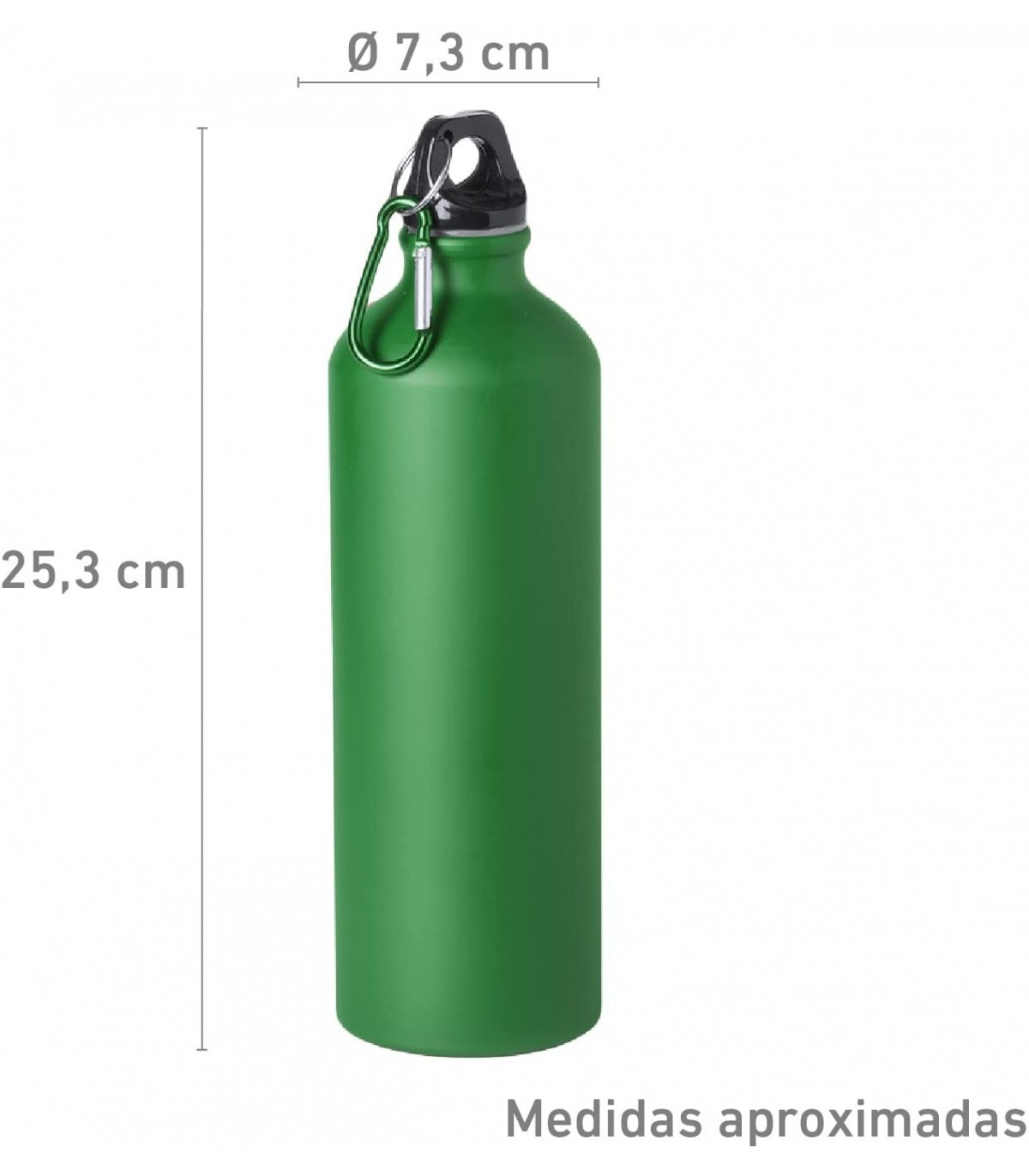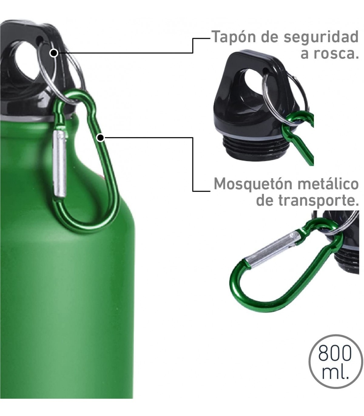 Botella de Aluminio, 800 ml, Tapon de Seguridad y Mosqueton Metalico Verde