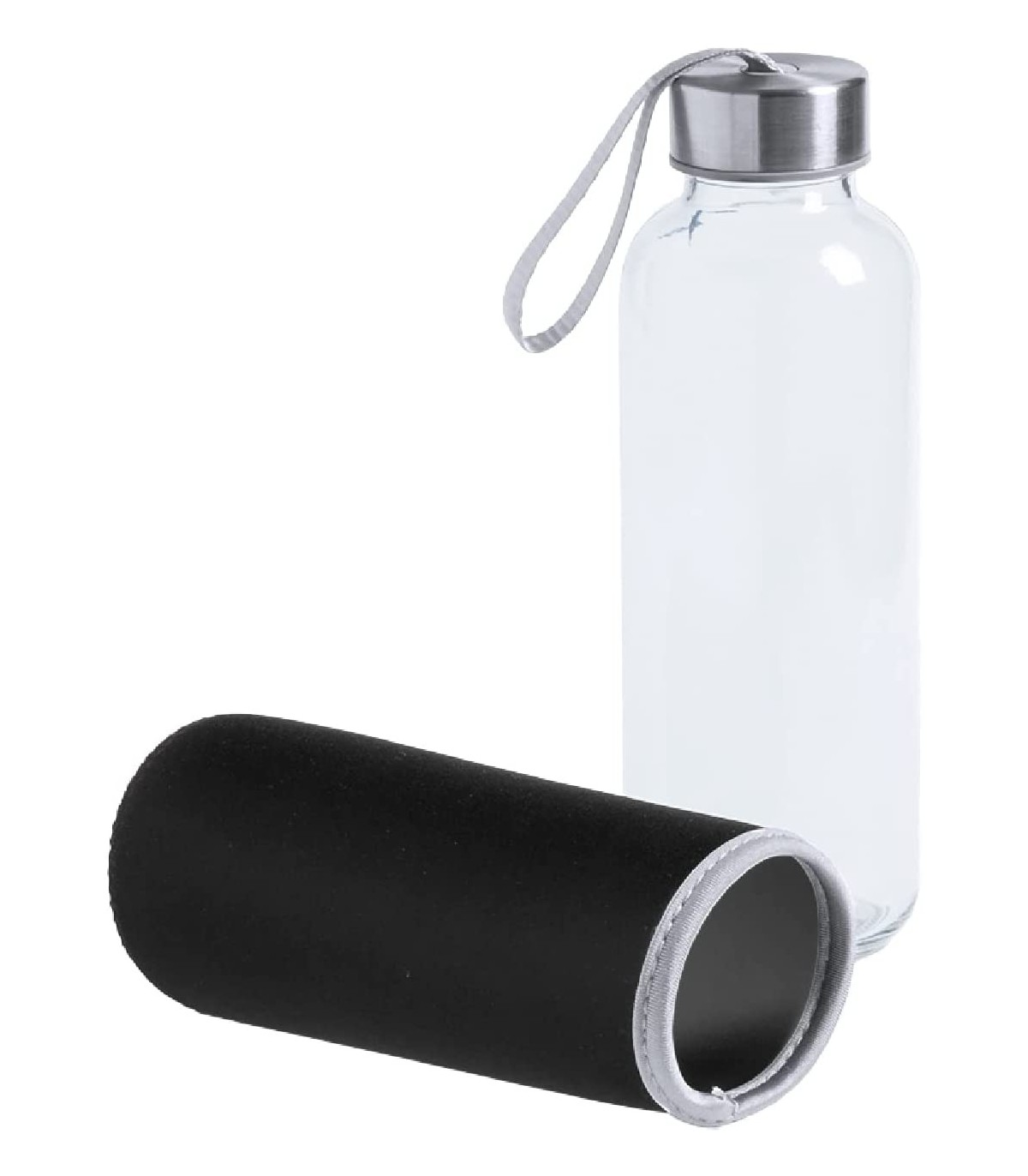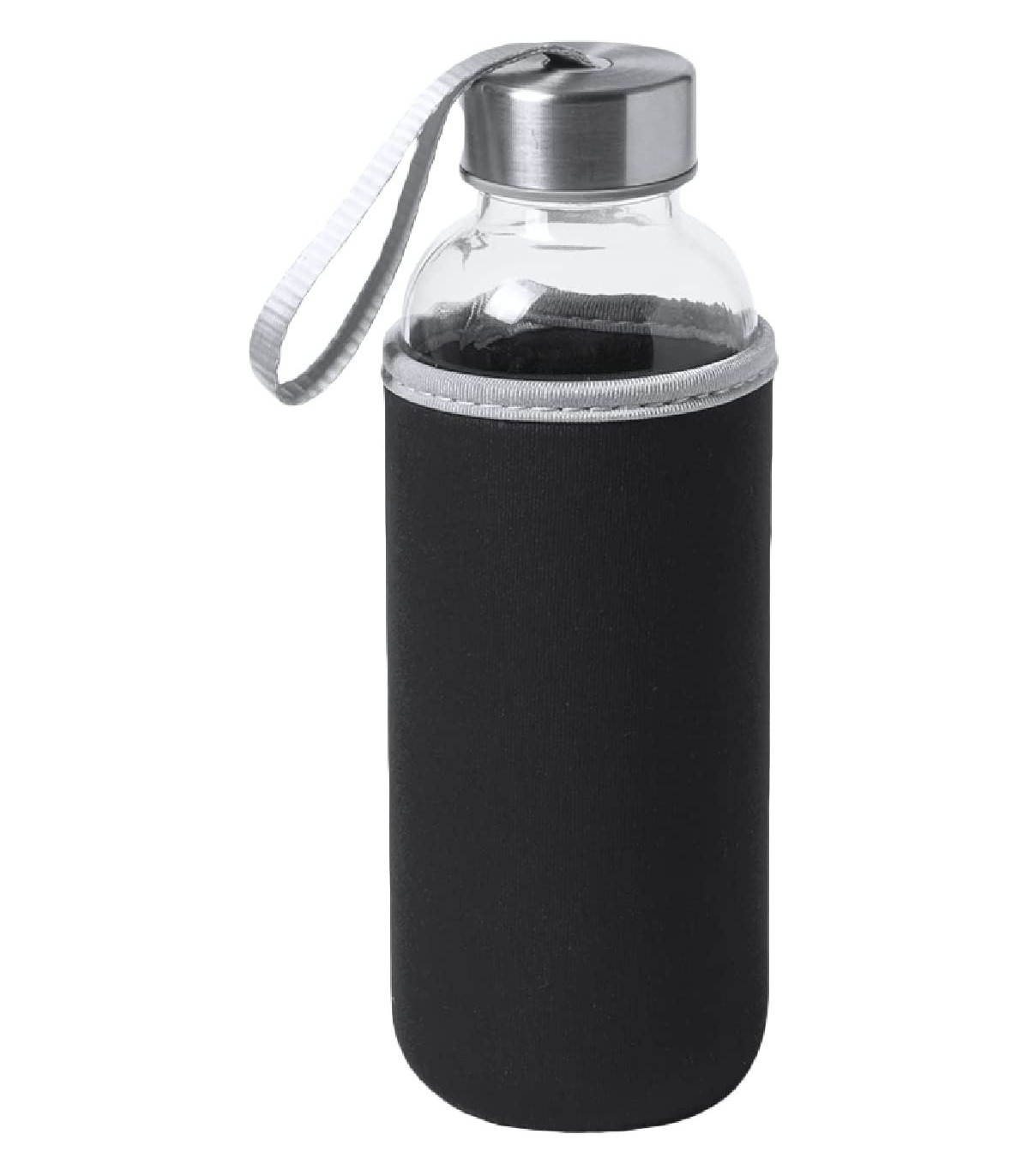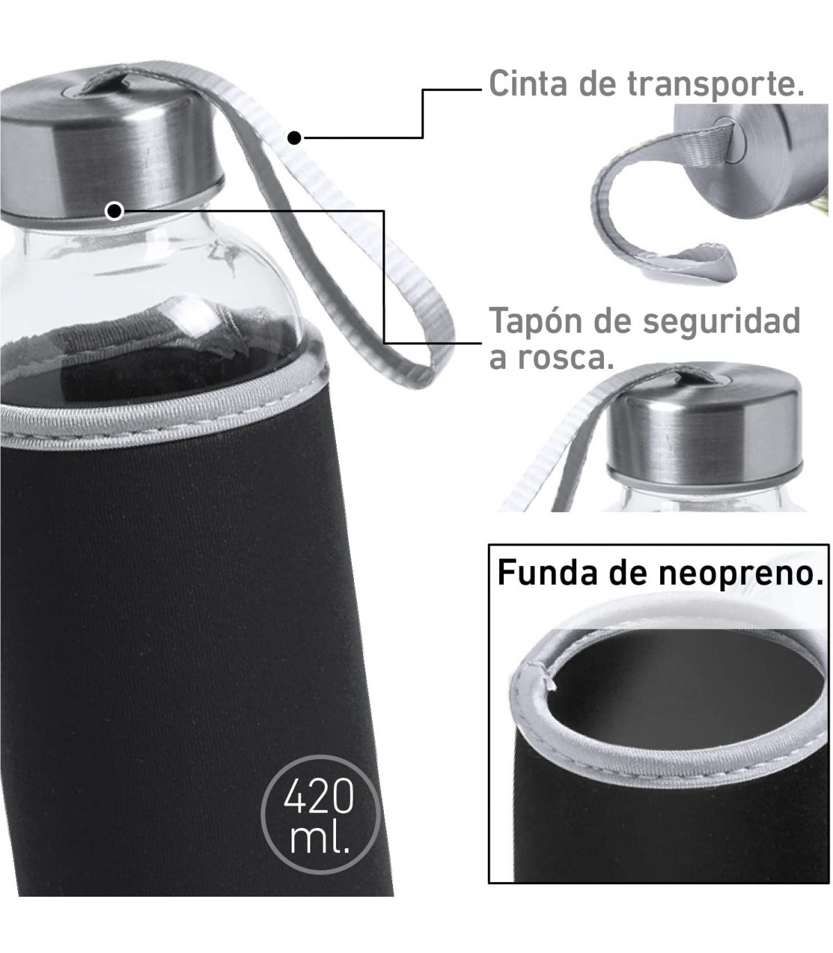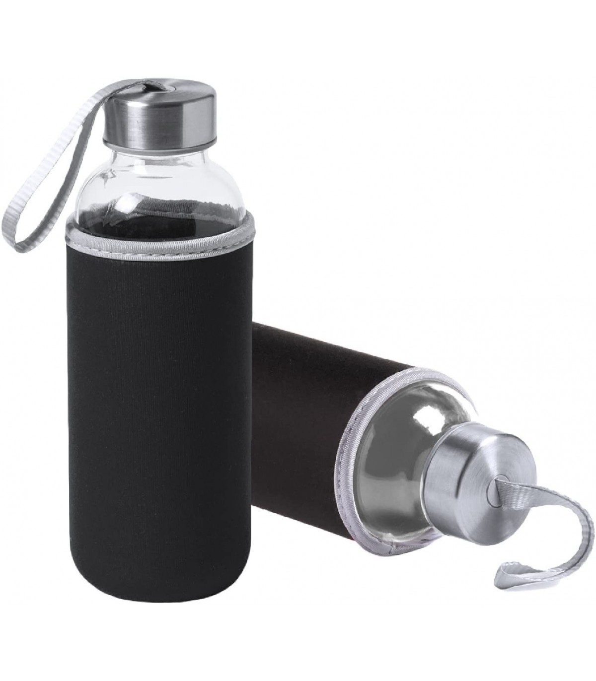 Pack 2 Botellas de Cristal con Funda de Neopreno, 420 ml, Tapon a Rosca y Cinta de Transporte, Color Negro