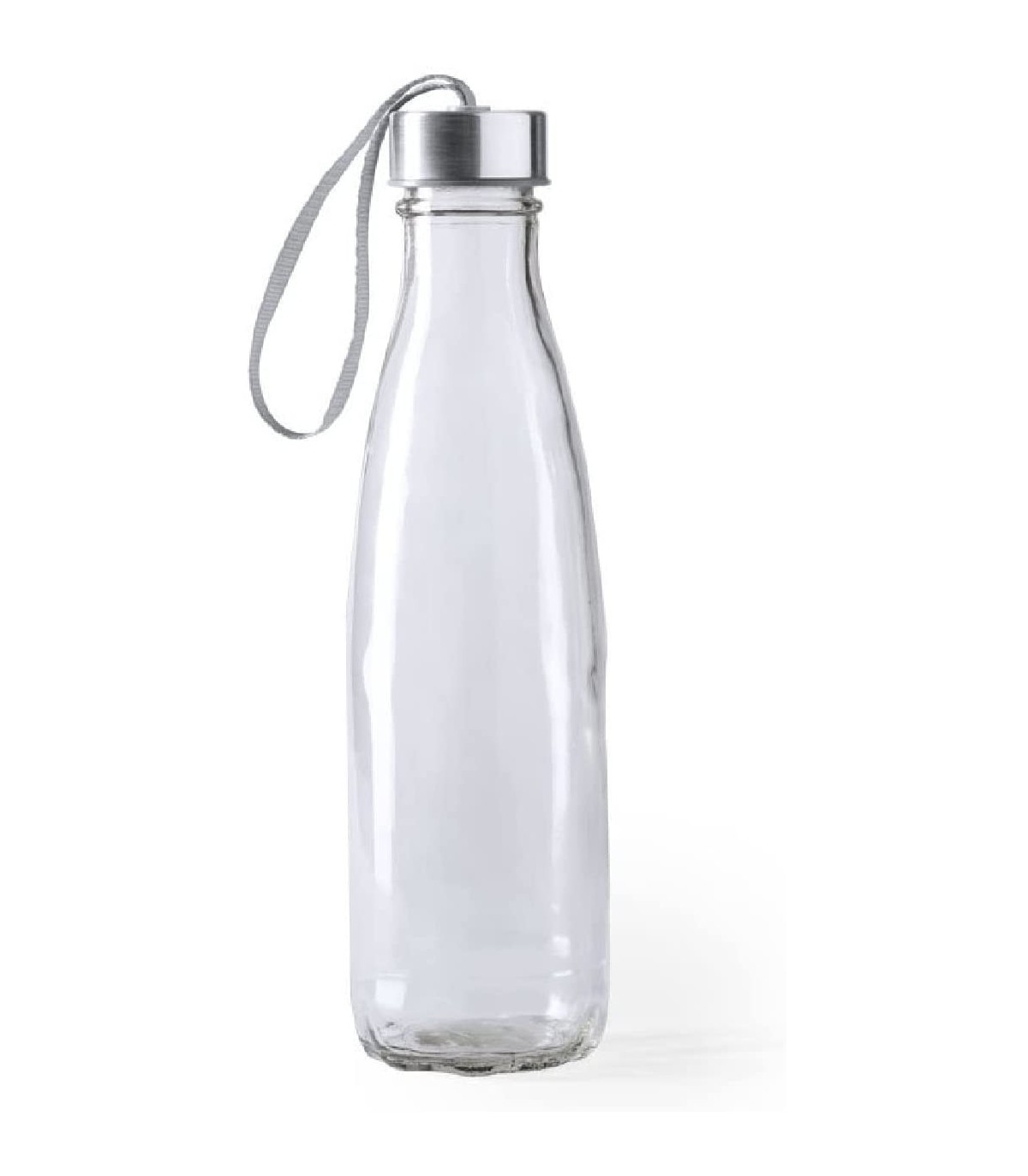 Mantente hidratado con nuestra botella de cristal transparente. Este bidón es fácilmente transportable gracias al cordón de transporte anclado al tapón de seguridad. Nuestra cantimplora de agua, fabricada en cristal y tapón de aluminio, es resistente y ligera. Con su tapón de rosca de seguridad es perfecta para el gimnasio, la oficina o para clase.