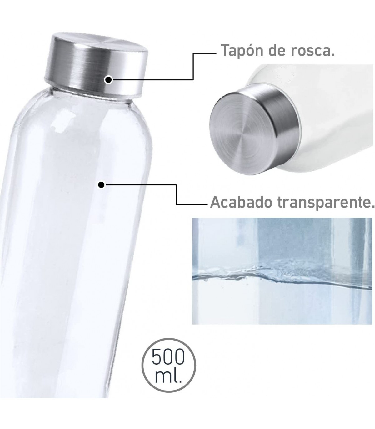 Mantente hidratado con nuestra botella transparente con acabados en distintos colores y tapón de acero inoxidable. Este bidón es fácilmente transportable, resistente y con tapón a rosca de acero inoxidable con un acabado cromado.