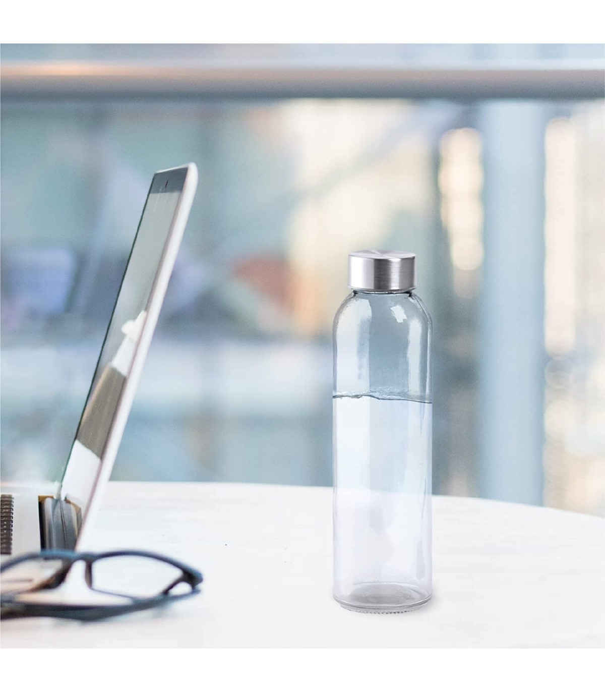 Nuestra cantimplora de agua, fabricada en cristal y con tapón de acero inoxidable es perfecta para el gimnasio, la oficina o para clase.