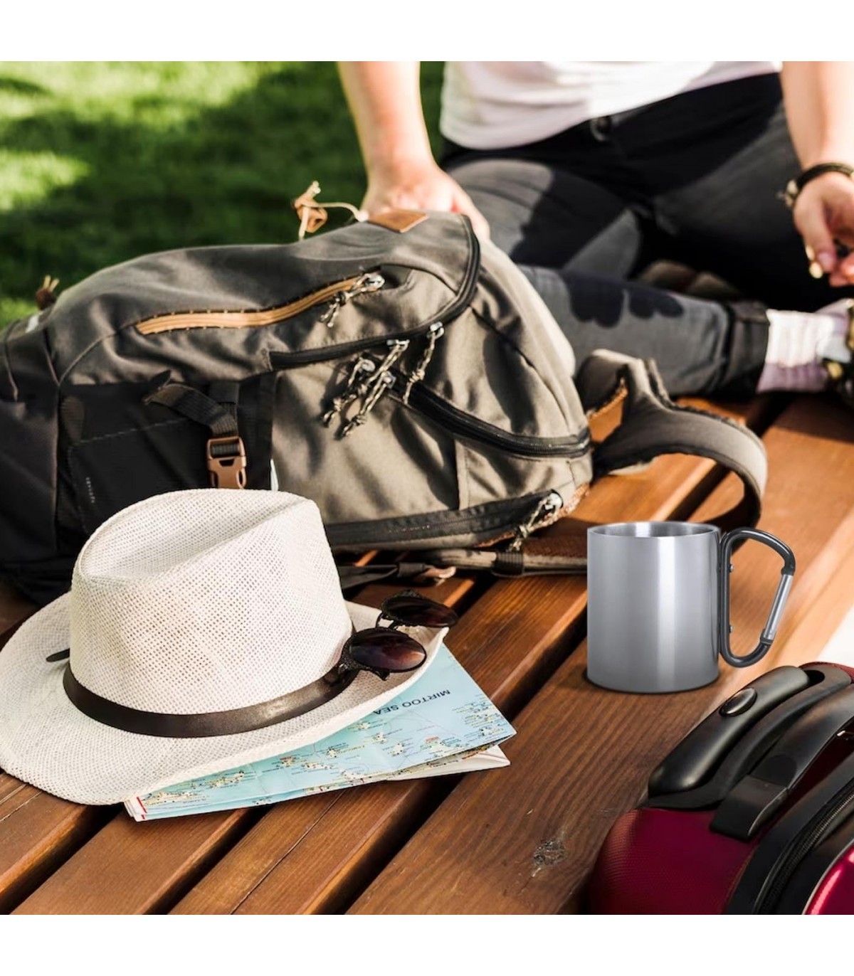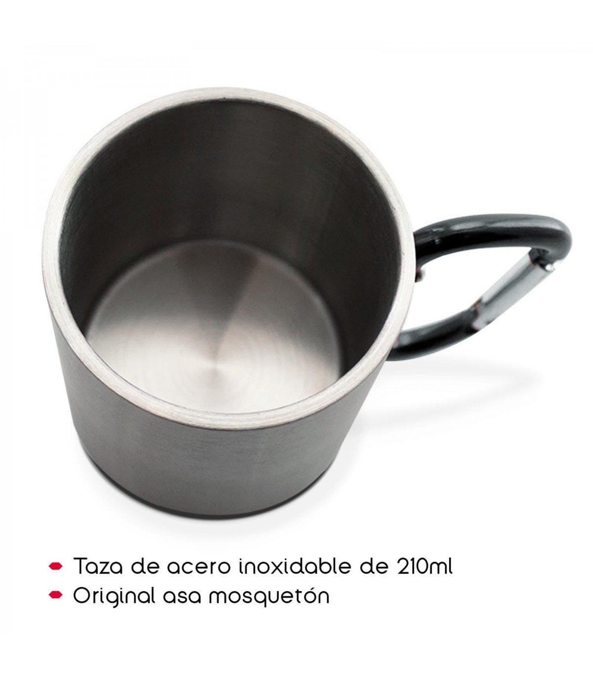Una de las características destacadas de esta taza es el mosquetón incluido. Este práctico accesorio te permite enganchar la taza a tu mochila, bolso, llavero o cualquier otra superficie adecuada. Además, está diseñado para ser resistente y seguro, garantizando que tu taza esté siempre a tu alcance cuando la necesites, está disponible en una amplia gama de colores: rojo, azul, negro y plata. Puedes elegir el que más te guste y combinarlo con tu estilo personal.