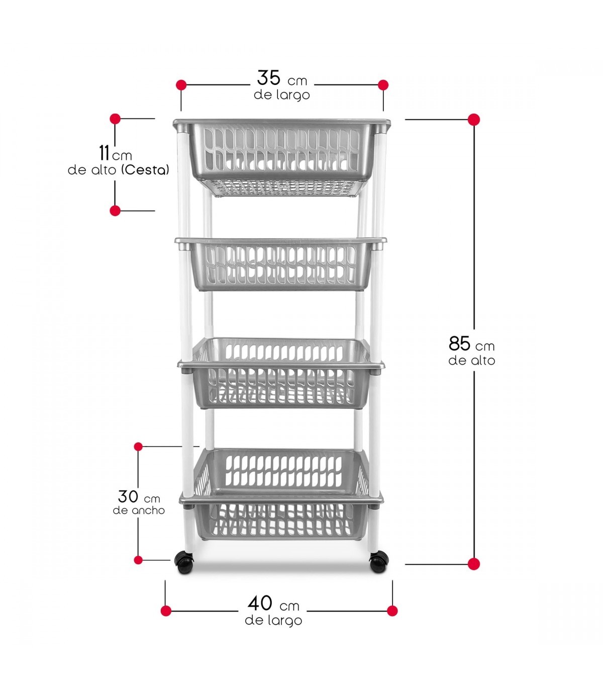 Optimiza tu espacio y agrega un toque de organización elegante con nuestro carrito de cocina de 4 cestas. Diseñado para la máxima practicidad, este carrito se desplaza sin esfuerzo con sus ruedas suaves, ofreciéndote un almacenamiento versátil donde lo necesites.