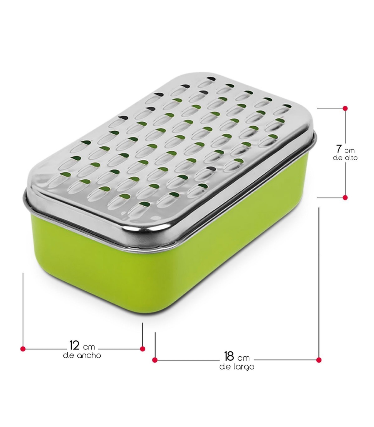 Con medidas de 18 cm de largo x 12 cm de ancho x 7 cm de alto, este rallador se adapta perfectamente a tu espacio de trabajo en la cocina y es fácil de almacenar.
