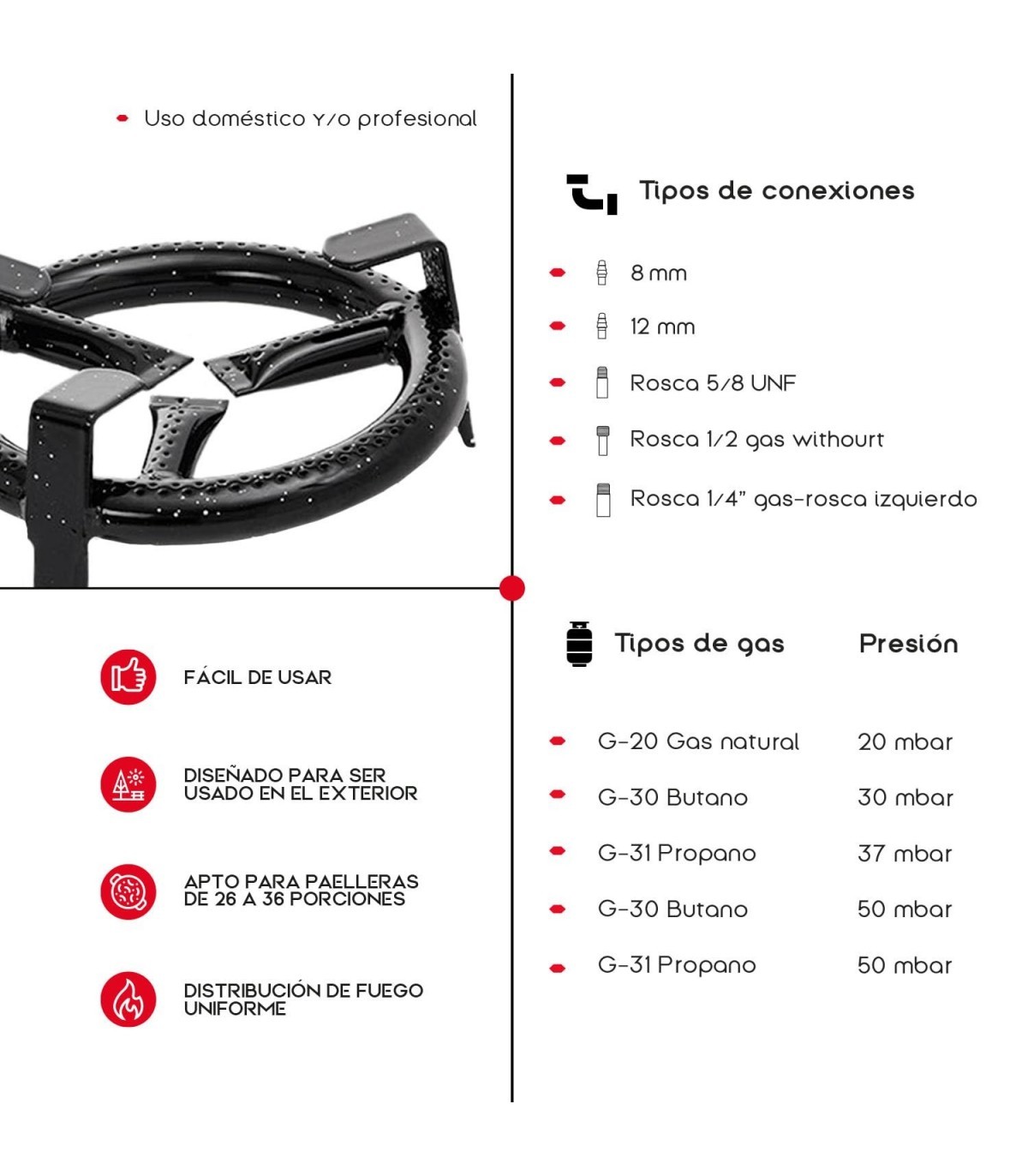 ? Seguridad y Estabilidad: Equipado con una estructura robusta, este quemador ofrece máxima estabilidad y seguridad durante su uso, permitiéndote cocinar con total confianza y tranquilidad.