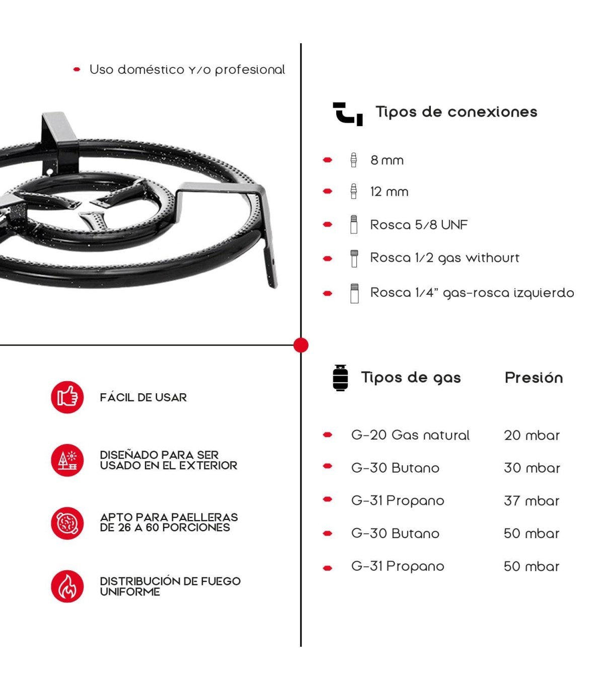 ? Quemador Redondo Eficiente: Su diseño redondo asegura una distribución uniforme del calor, permitiendo una cocción homogénea de tus paellas y otros platillos, para resultados perfectos en cada uso.