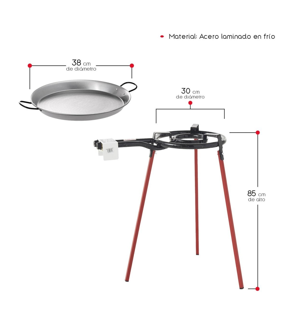 Set Paellero de Gas, 3 Patas Reforzadas, 85 cm, Negro y Rojo, Soporta 60 Kg, 38 cm
