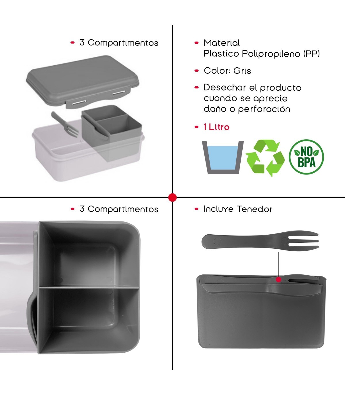 Fiambrera, Polipropileno Libre de BPA, 3 Compartimentos, 13x19.6x7.3 cm, 1L (Gris)