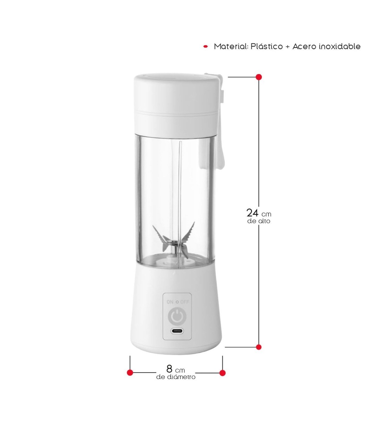 Licuadora, 8x24 cm, 380 ml, Plástico y Acero Inoxidable, 6 cuchillas 3D, Blanco, Cable USB de Carga