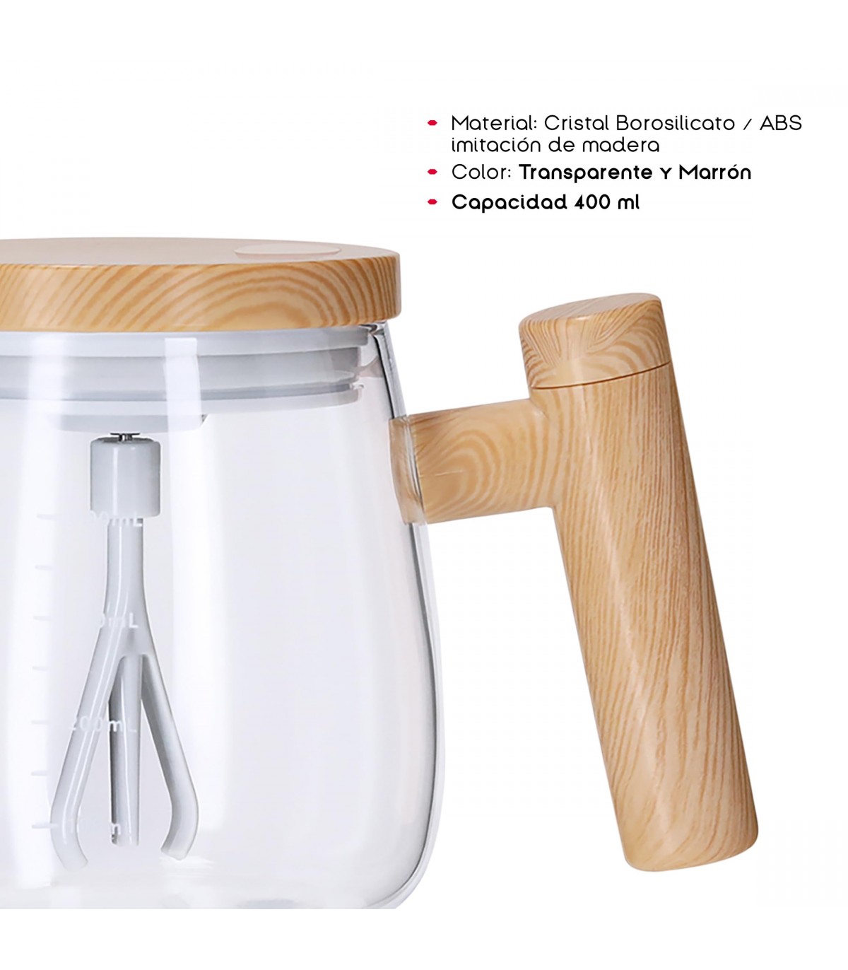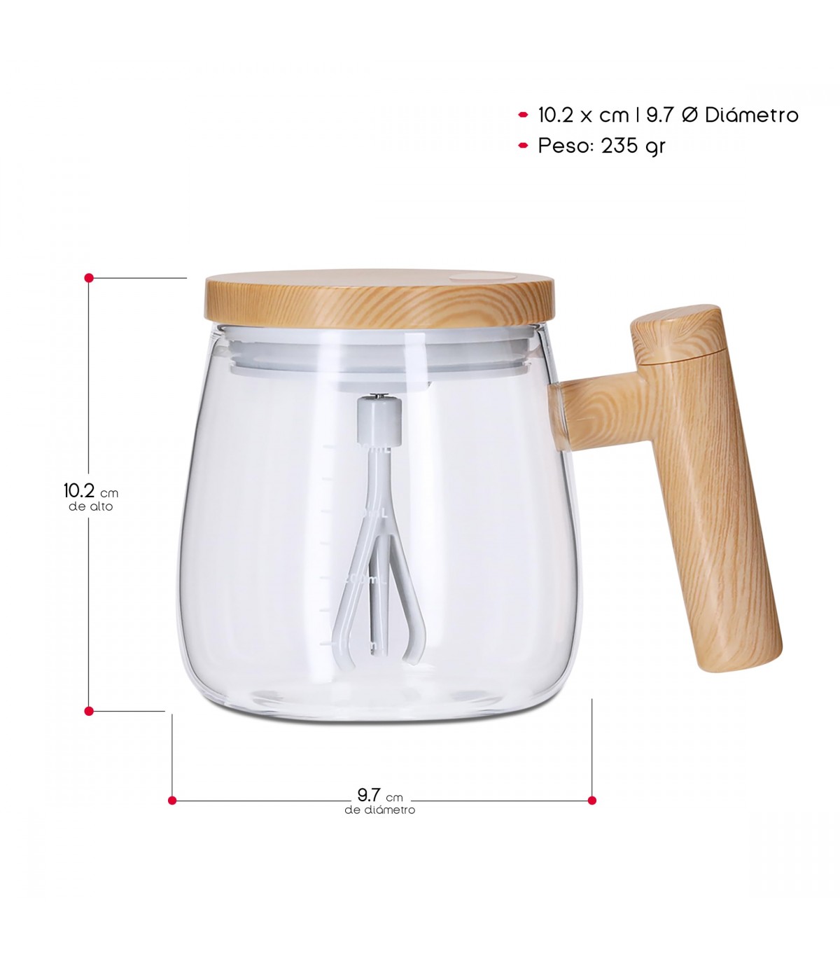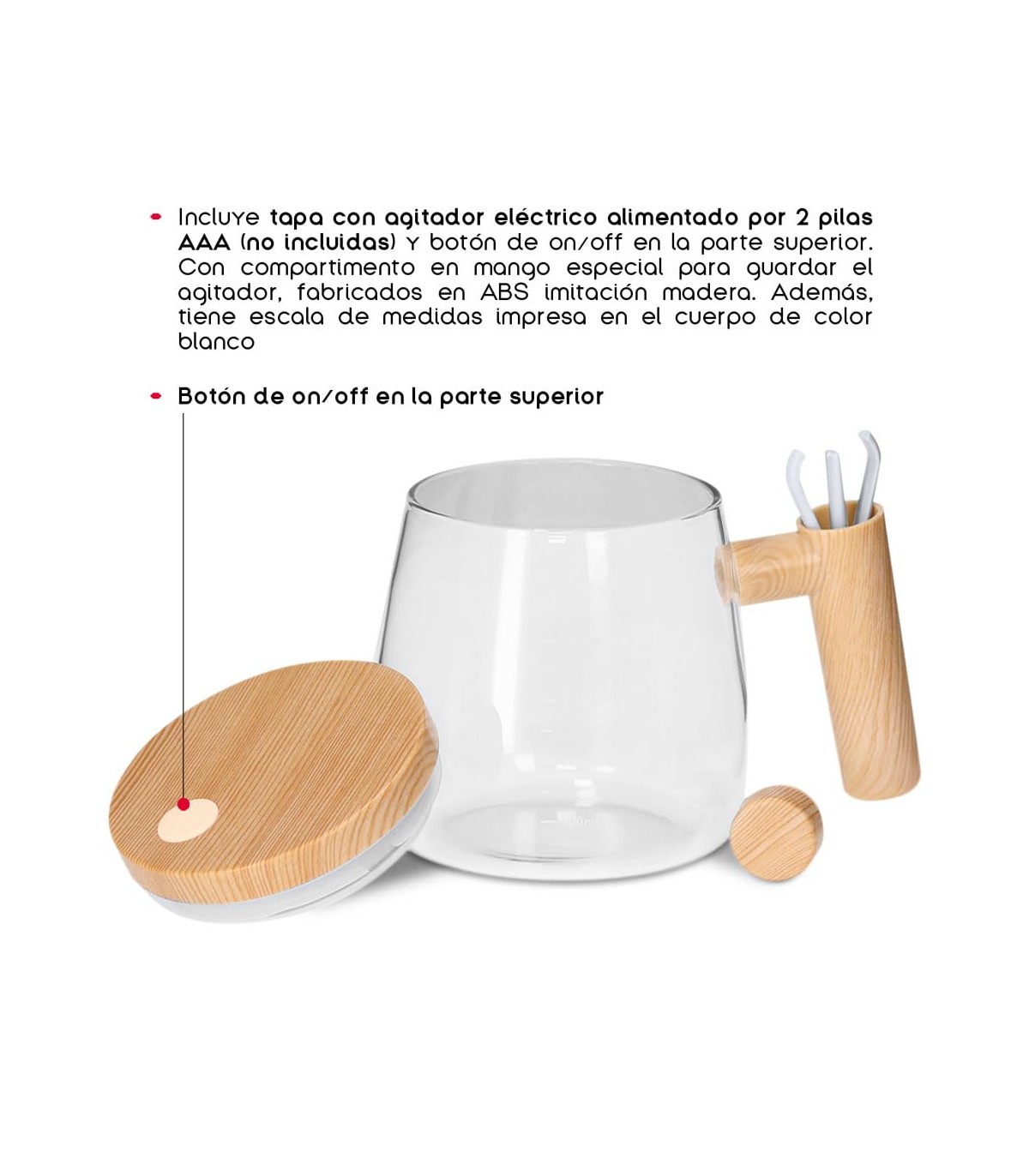 MEZCLADOR AUTOMÁTICO CON FUNCIONAMIENTO ELÉCTRICO. Incluye tapa con agitador eléctrico alimentado por 2 pilas AAA (no incluidas), activado por un botón on/off en la parte superior para un uso fácil y sin esfuerzo.