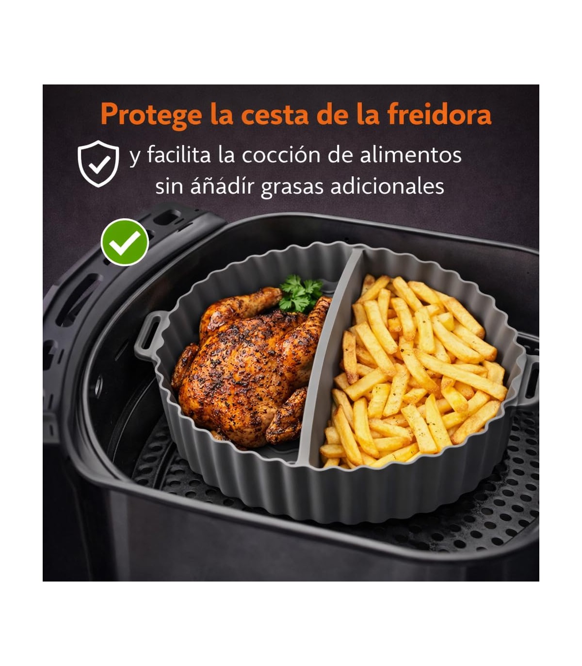 PROTEGE LA CESTA DE LA FREIDORA. Evita residuos y suciedad directa en la cesta, prolongando su vida útil y facilitando la limpieza tras cada uso.