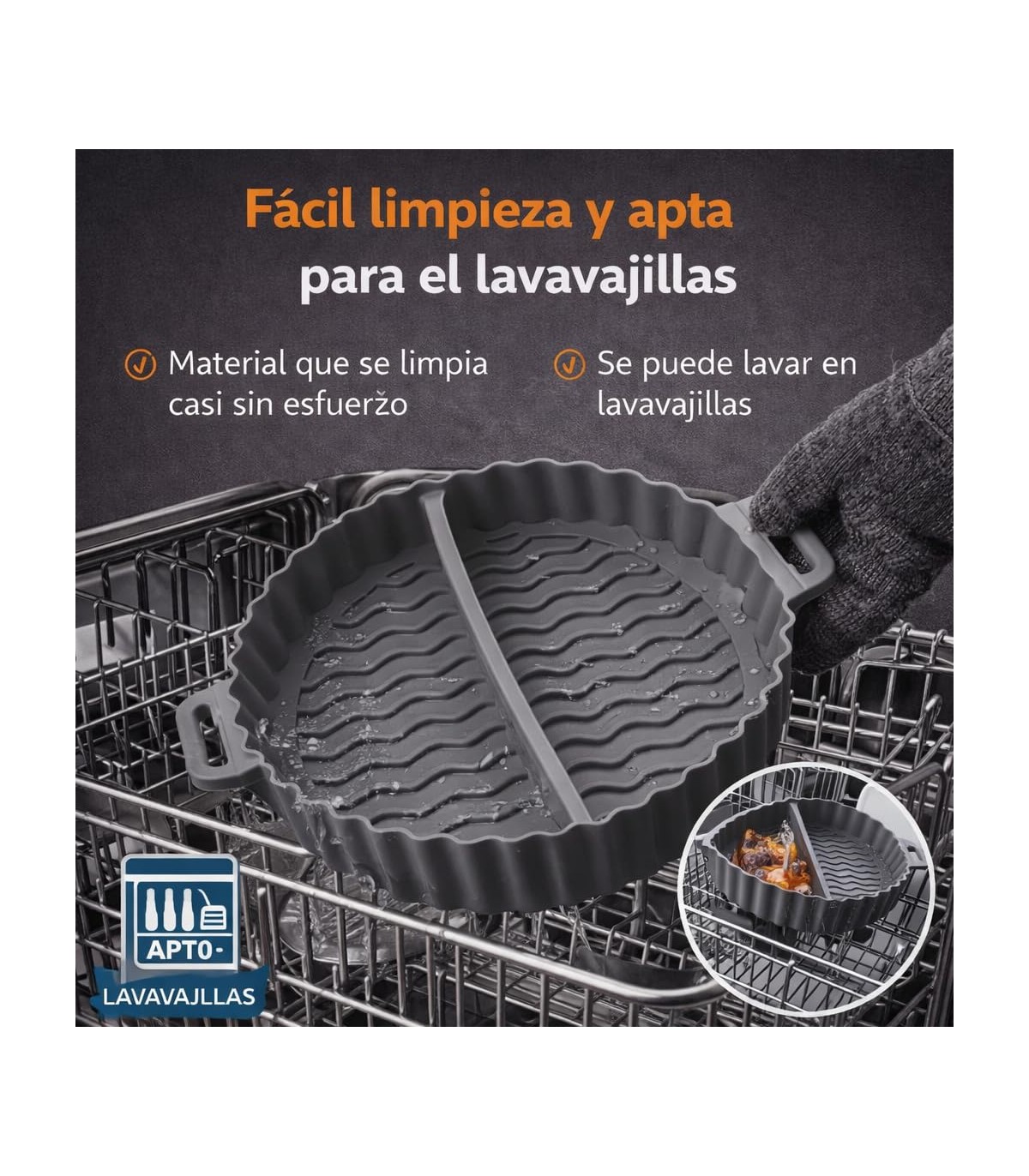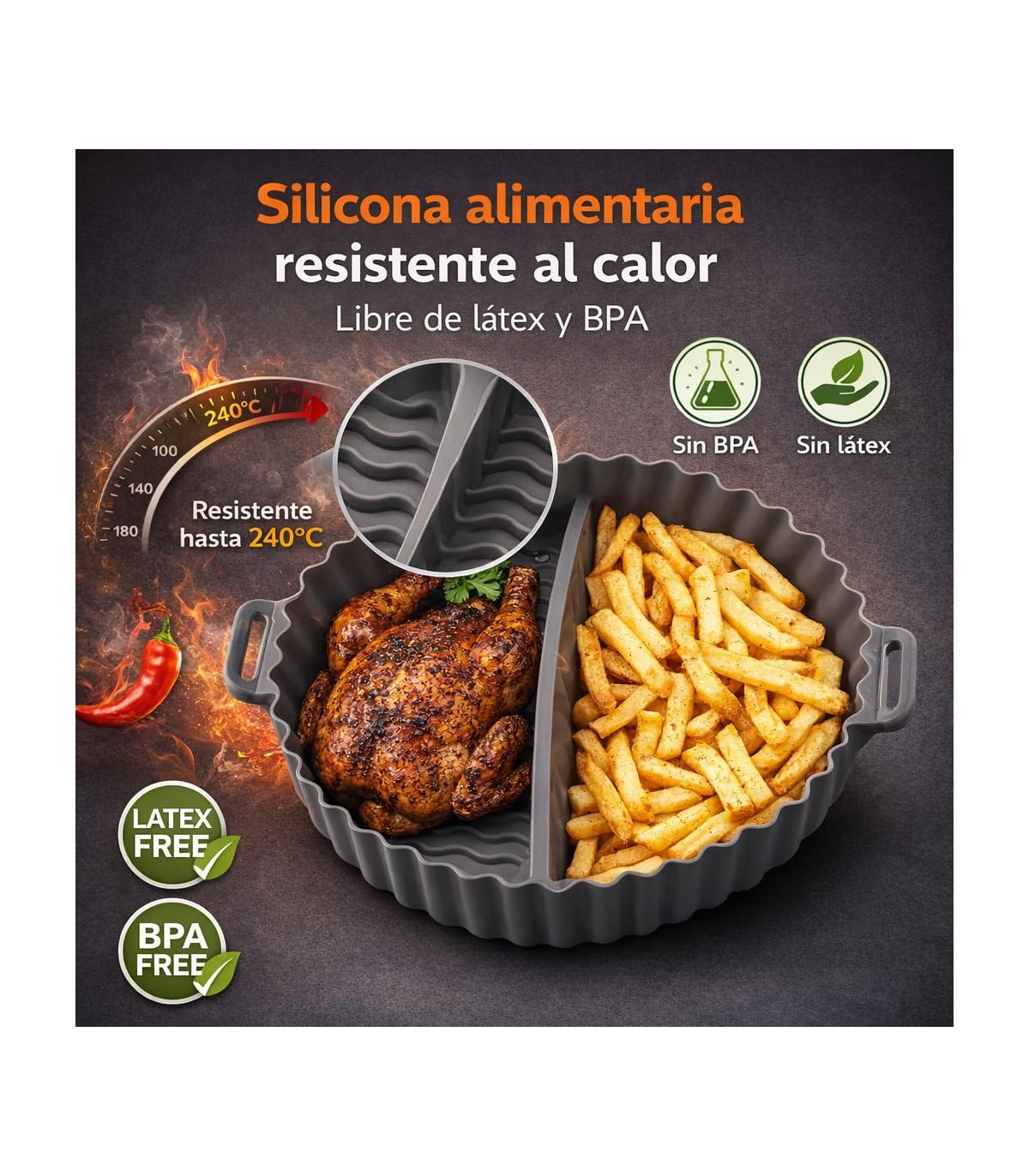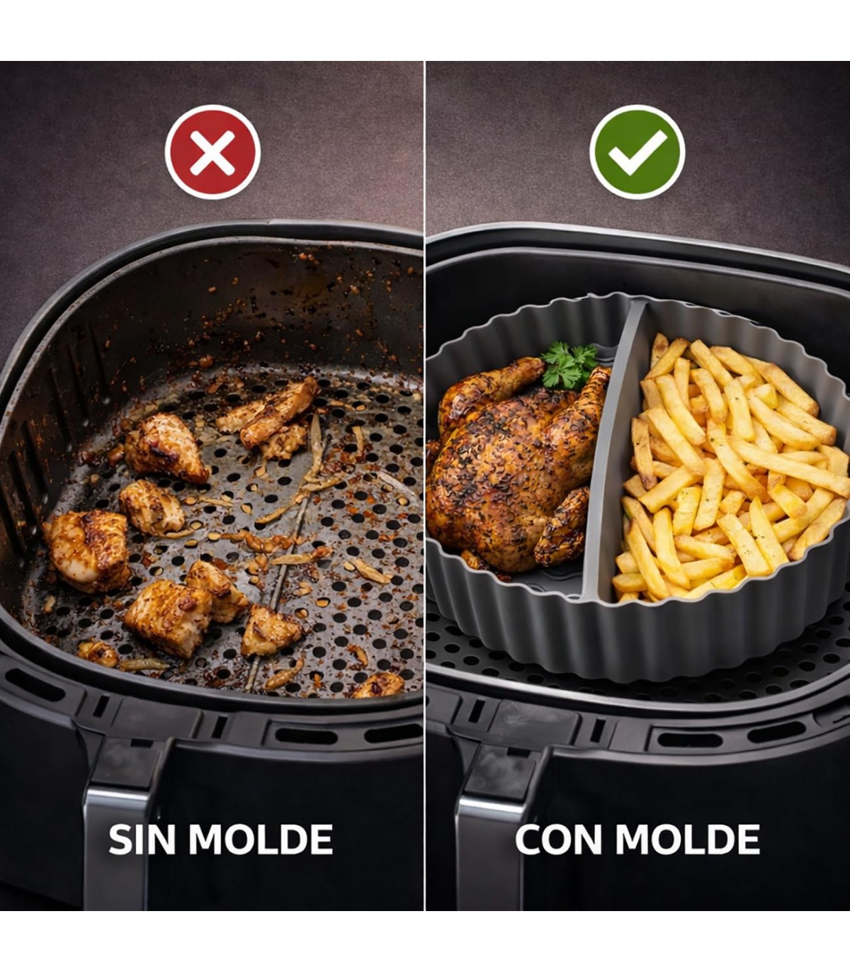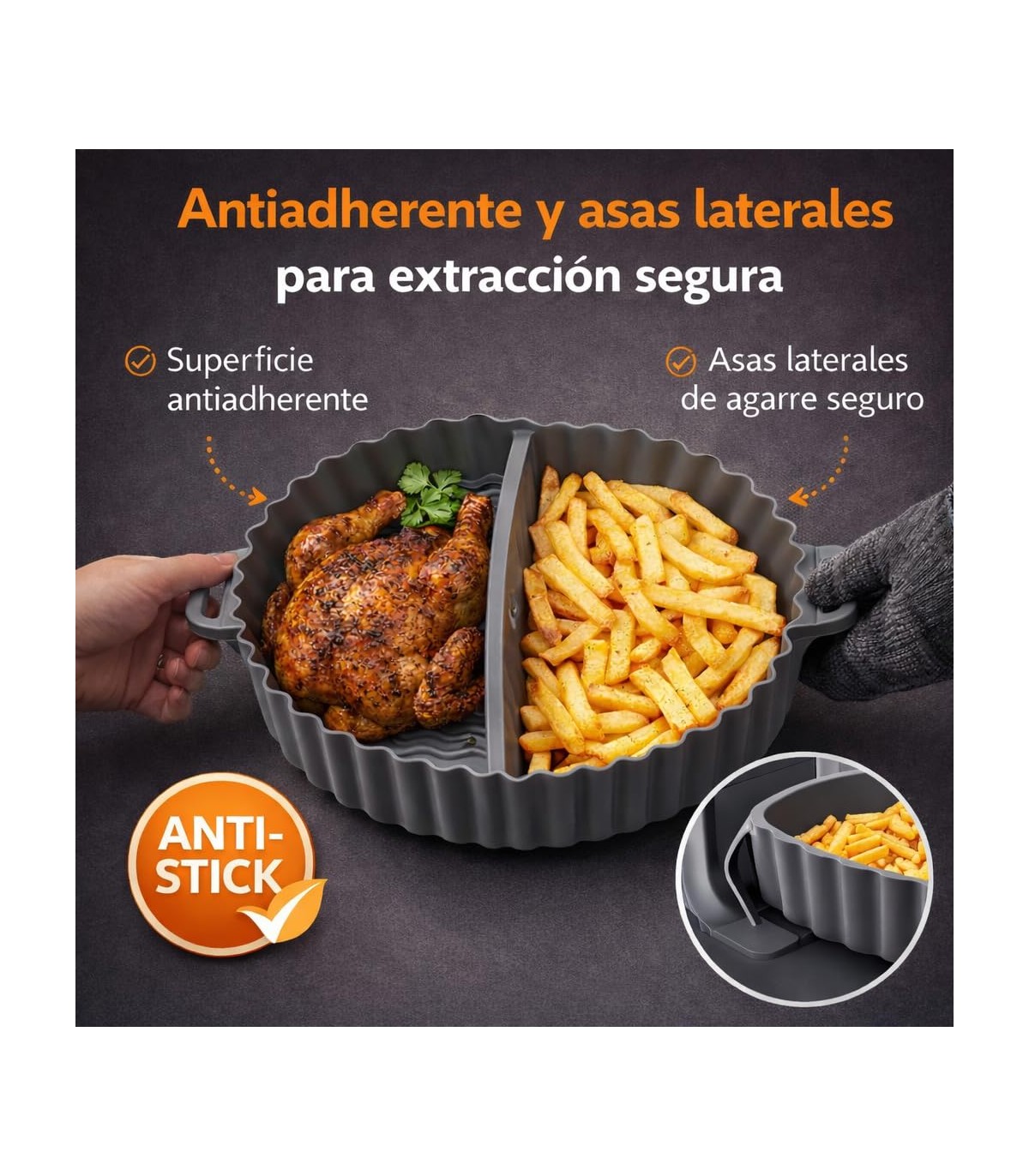SILICONA RESISTENTE A ALTAS TEMPERATURAS. Fabricado en material duradero y flexible, soporta el calor de la freidora de aire manteniendo su forma y funcionalidad.