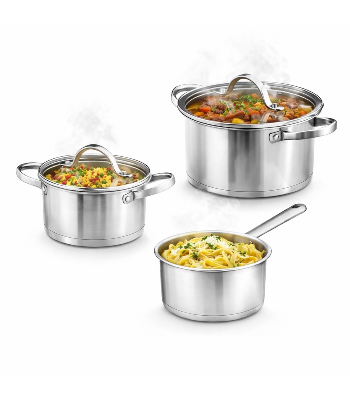 Equipa tu cocina con el Set de 3 Cacerolas TIENDA EURASIA, diseñado para ofrecer versatilidad, resistencia y comodidad en el día a día. Fabricadas con materiales de calidad como acero inoxidable y aluminio, garantizan una cocción eficiente y uniforme. Este práctico conjunto incluye diferentes tamaños para adaptarse a todo tipo de preparaciones, desde salsas hasta guisos.