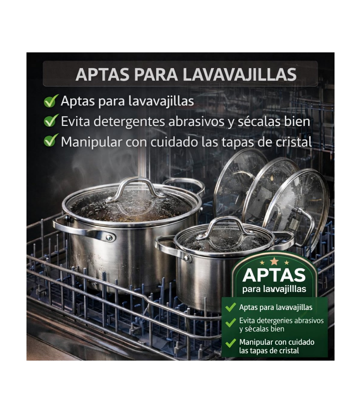 TAPAS DE CRISTAL CON VISOR. Permiten controlar la cocción sin necesidad de destapar, ayudando a conservar el calor y los aromas.