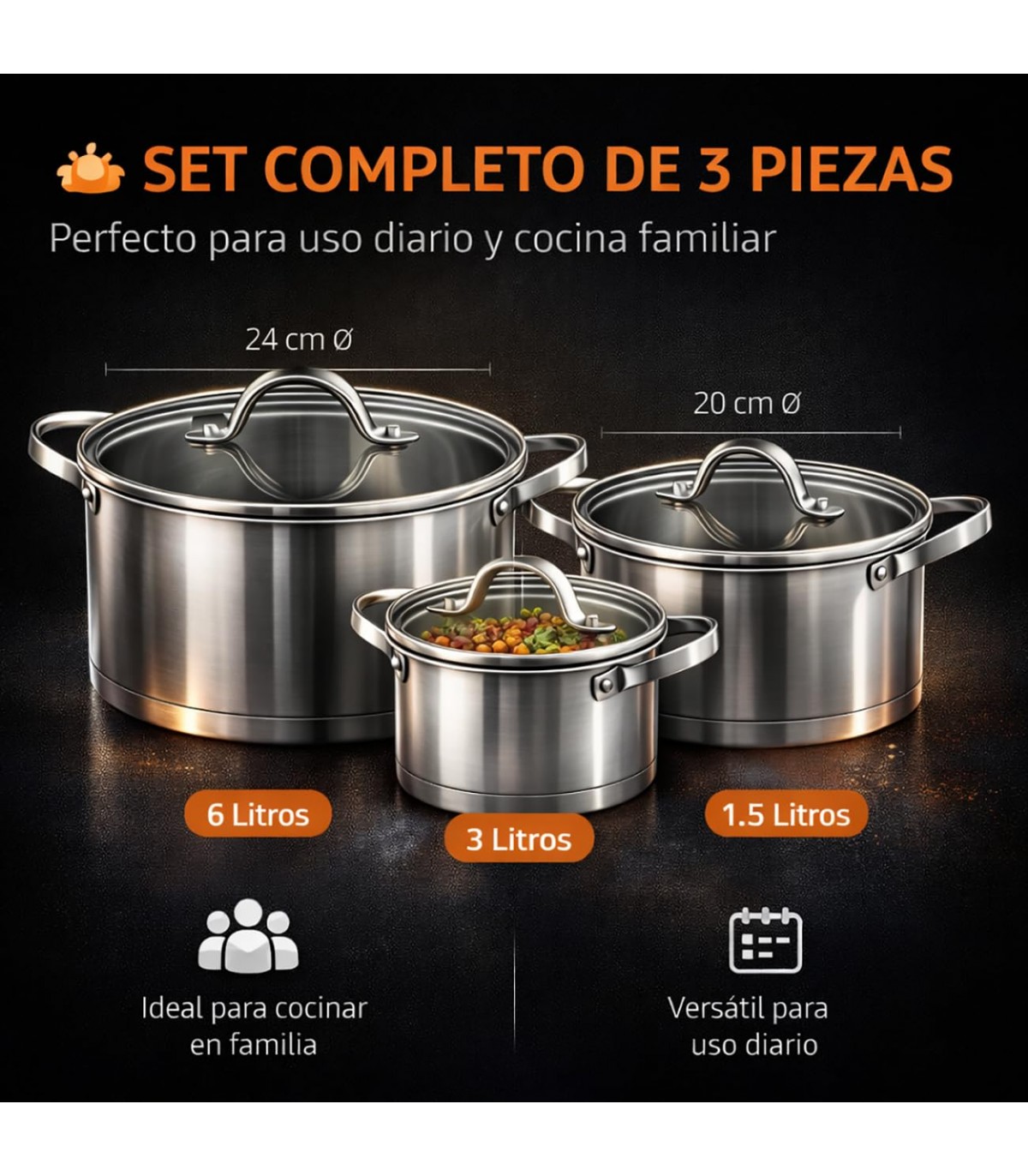 SET COMPLETO Y FUNCIONAL. Incluye 3 cacerolas con tapa en diferentes tamaños: cazo de 1,4 L (16 cm), olla de 1,8 L (18 cm) y olla de 2,8 L (20 cm), ideales para múltiples recetas.