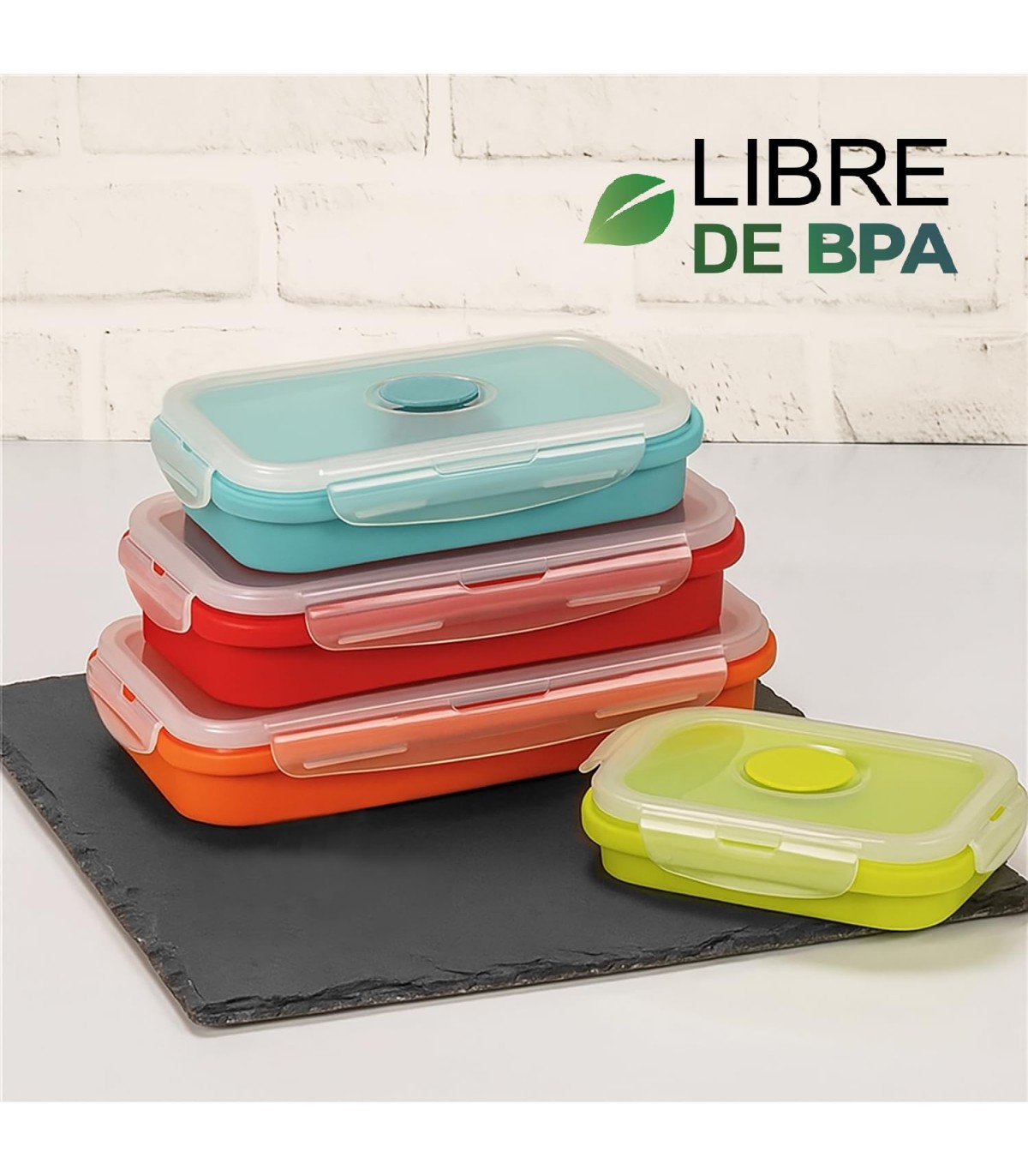 Organización práctica y segura para tu cocina y tus comidas. El Pack de 4 Fiambreras Plegables es la solución ideal para mantener tus alimentos frescos, organizados y listos para llevar. Con un diseño rectangular, tapas herméticas de PP y juntas de silicona a prueba de fugas, garantizan máxima seguridad y comodidad. Disponibles en colores vivos (verde, azul, rojo y naranja) y en diferentes capacidades, se adaptan a todas tus necesidades.