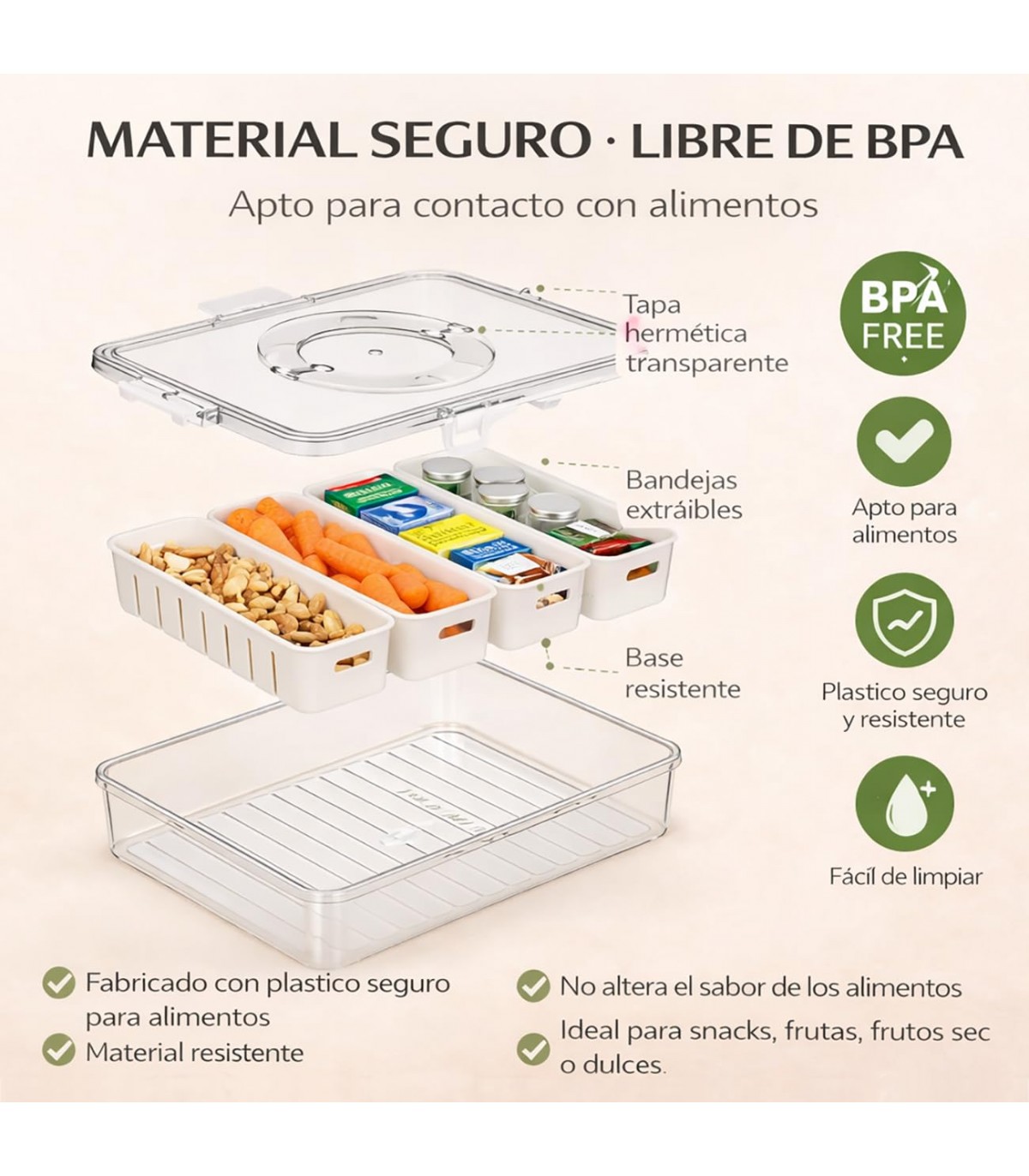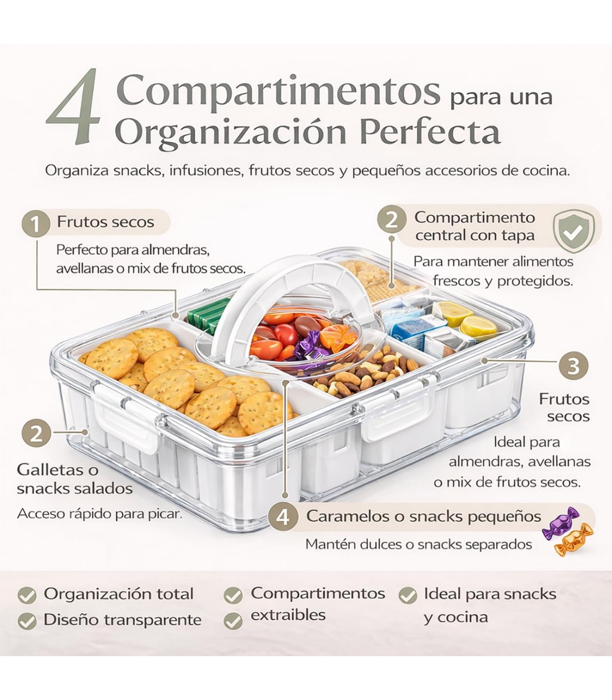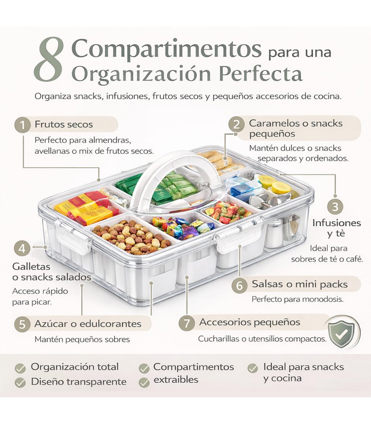 COMPARTIMENTOS PARA ORGANIZACIÓN EFICIENTE. Disponible con 4 u 8 divisiones, permite separar distintos alimentos o productos, manteniendo todo ordenado y fácilmente accesible.
