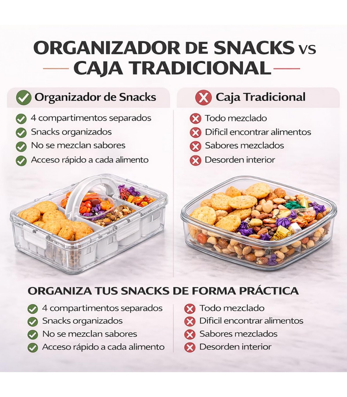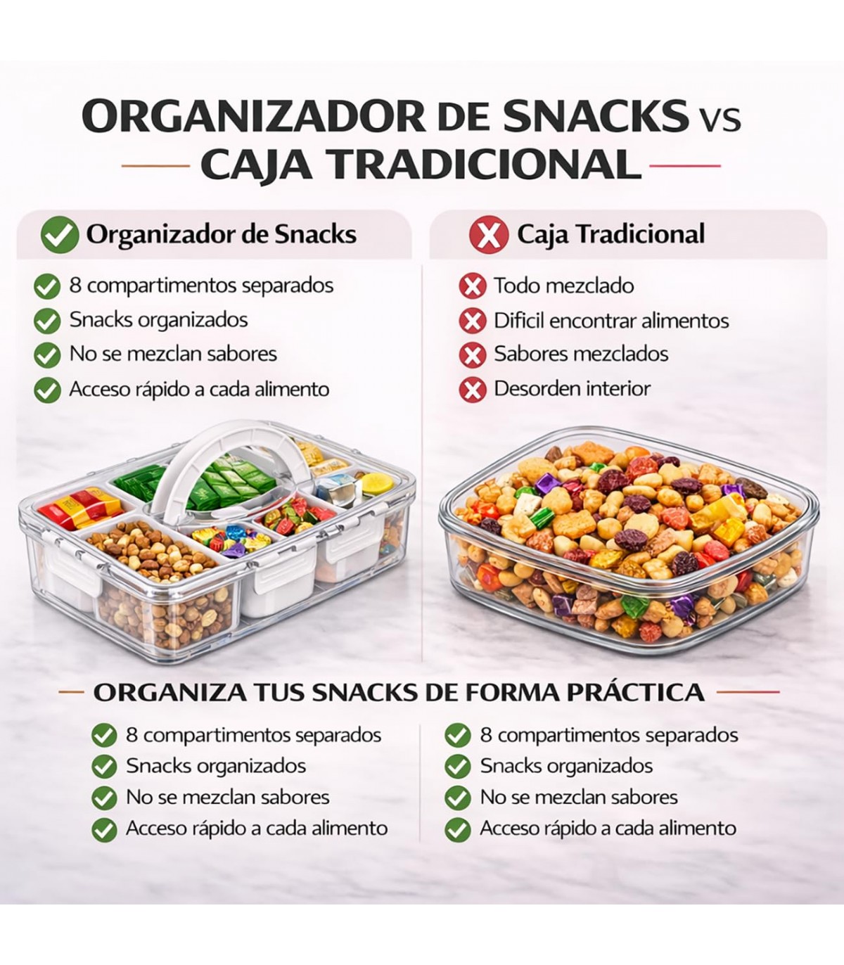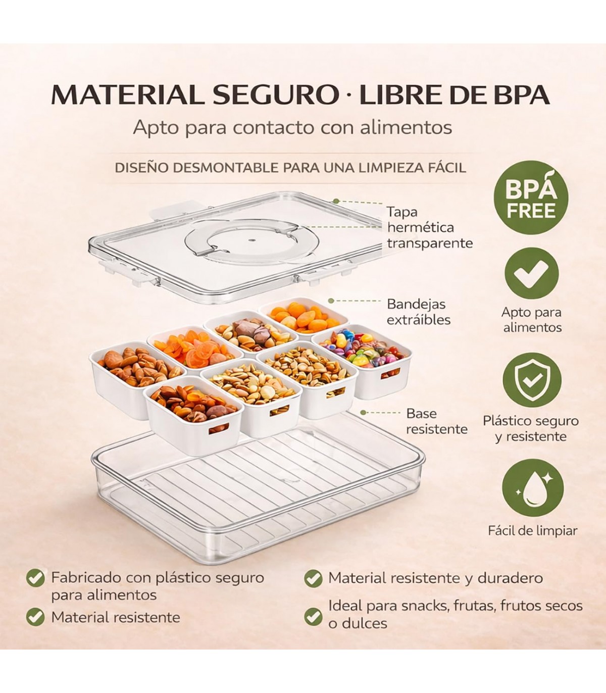 COMPARTIMENTOS PARA ORGANIZACIÓN EFICIENTE. Disponible con 4 u 8 divisiones, permite separar distintos alimentos o productos, manteniendo todo ordenado y fácilmente accesible.