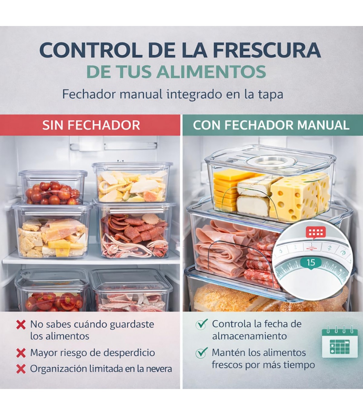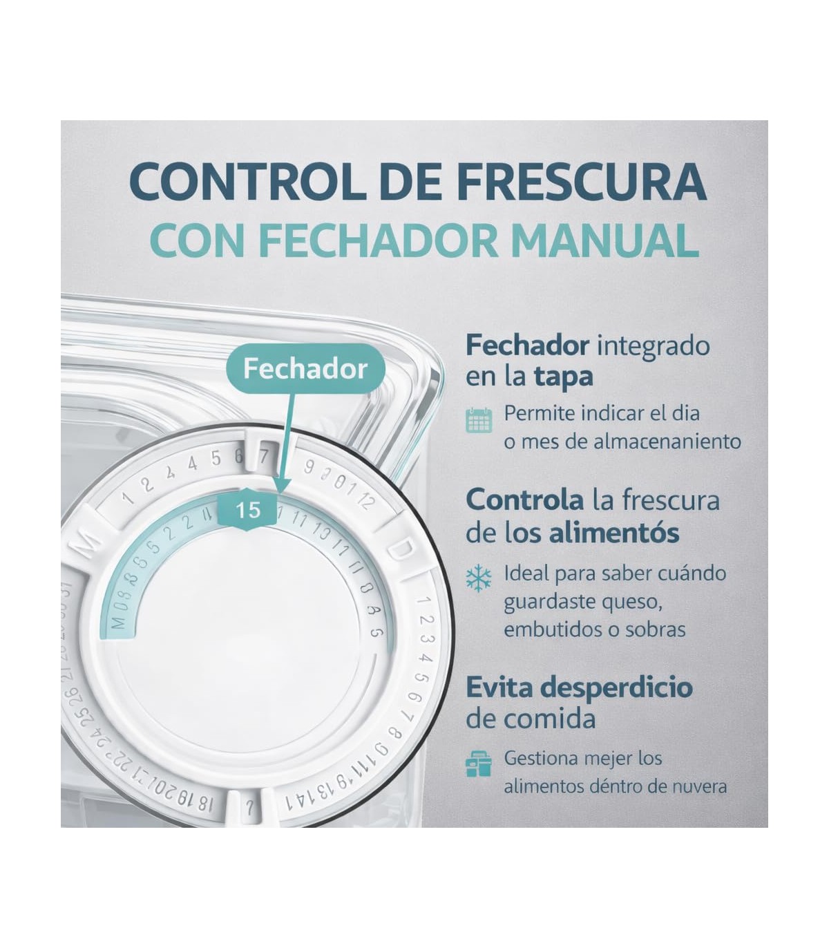 FECHADOR MANUAL INTEGRADO. Incorpora un sistema práctico para marcar la fecha de almacenamiento, ayudando a llevar un mejor control de la frescura de los alimentos.