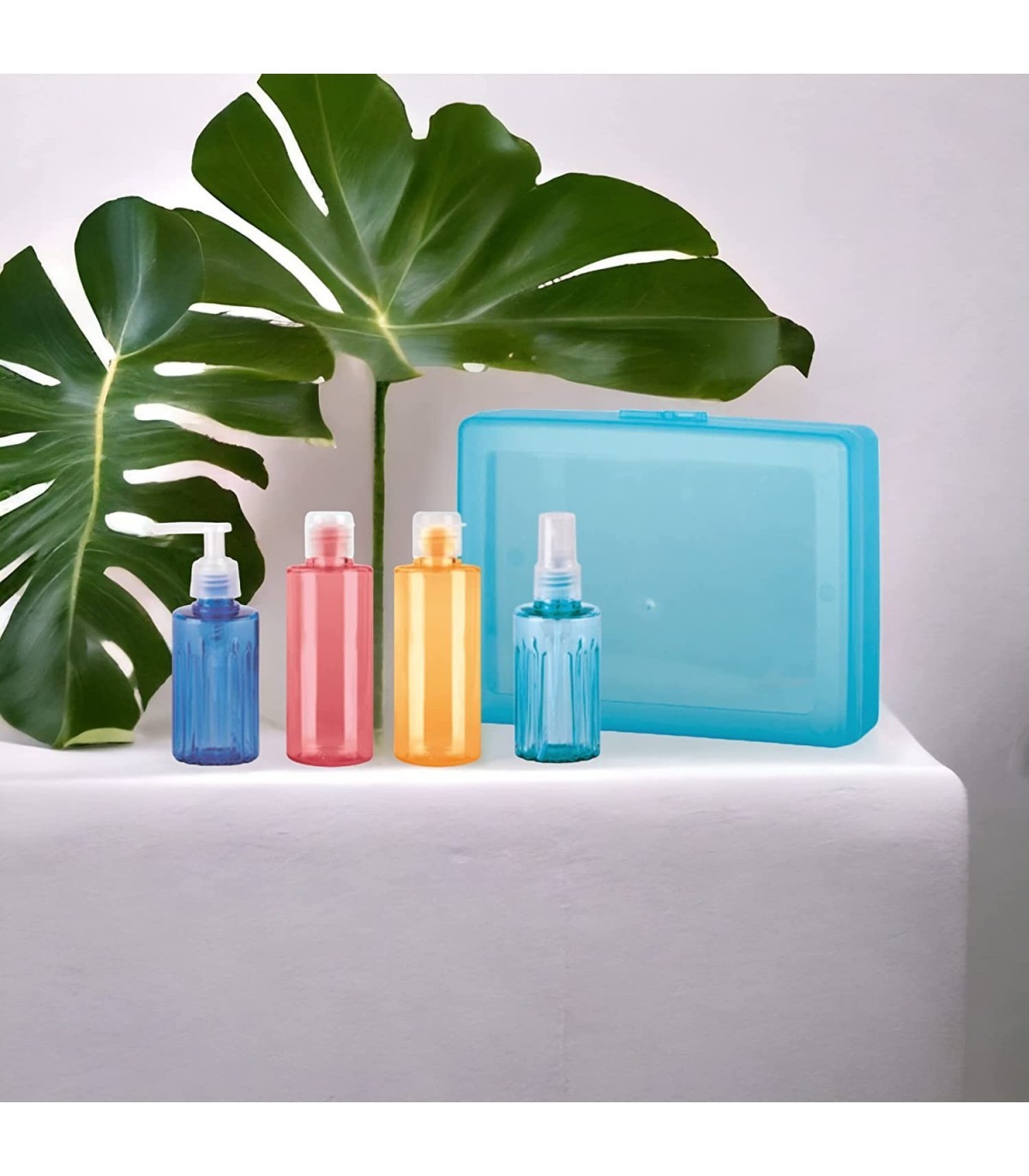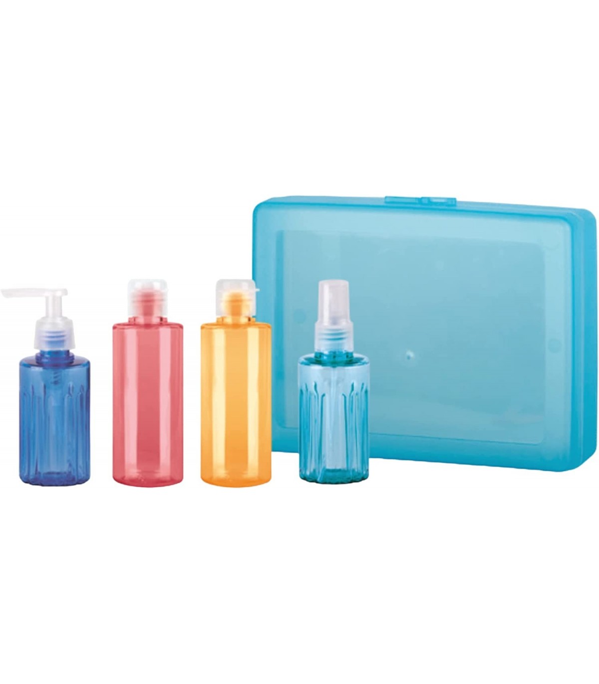 ¡Prepara tus viajes con nuestro Set de Viaje de 4 piezas! Este set incluye un maletín de plástico resistente y 4 botes para líquidos con distintos dosificadores, lo que te permitirá llevar contigo tus productos de higiene personal de manera segura y organizada.