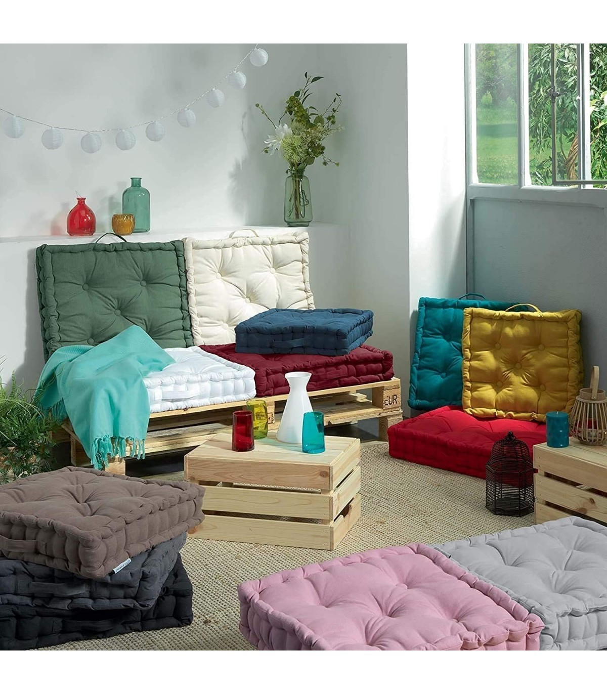 TIENDAEURASIA® Cojines de Suelo - 100% Algodón Lisa - Ideal para sillas, Bancos, palets, Suelos - Uso Interior y Exterior (Rojo Burdeos)