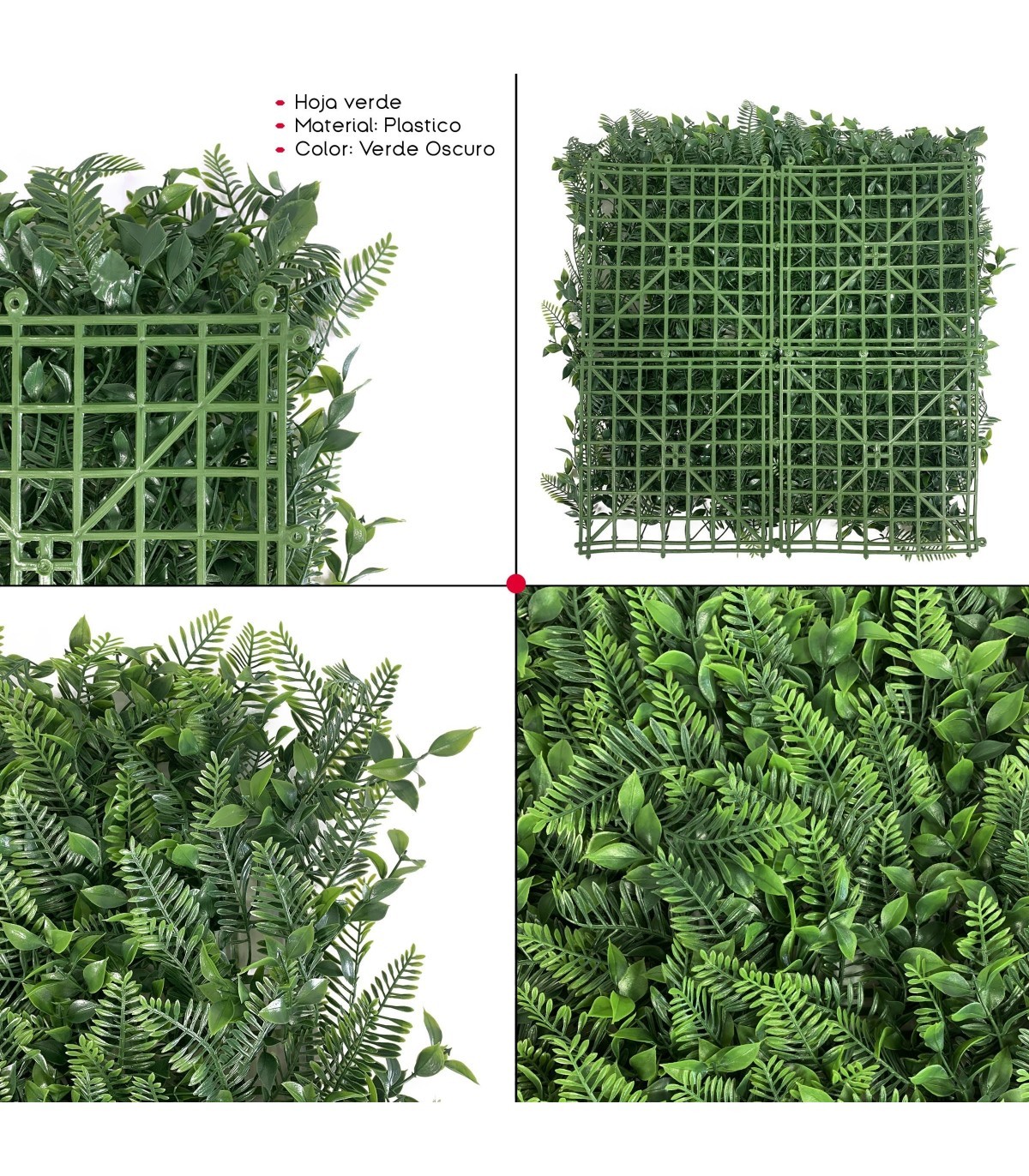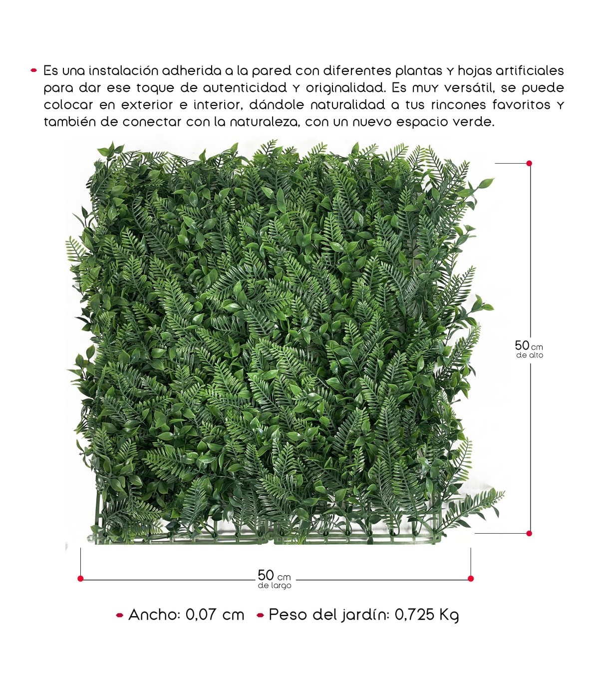 ? BAJO MANTENIMIENTO: Olvídate del riego y el cuidado constante. Este jardín vertical artificial ofrece la apariencia de plantas reales sin el mantenimiento que requieren, manteniéndose siempre verde y vibrante.