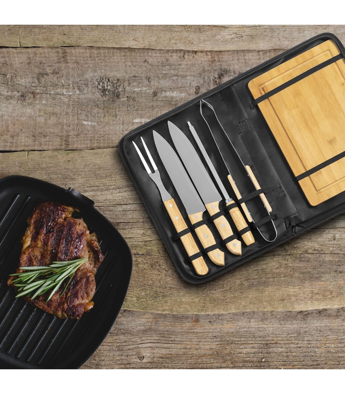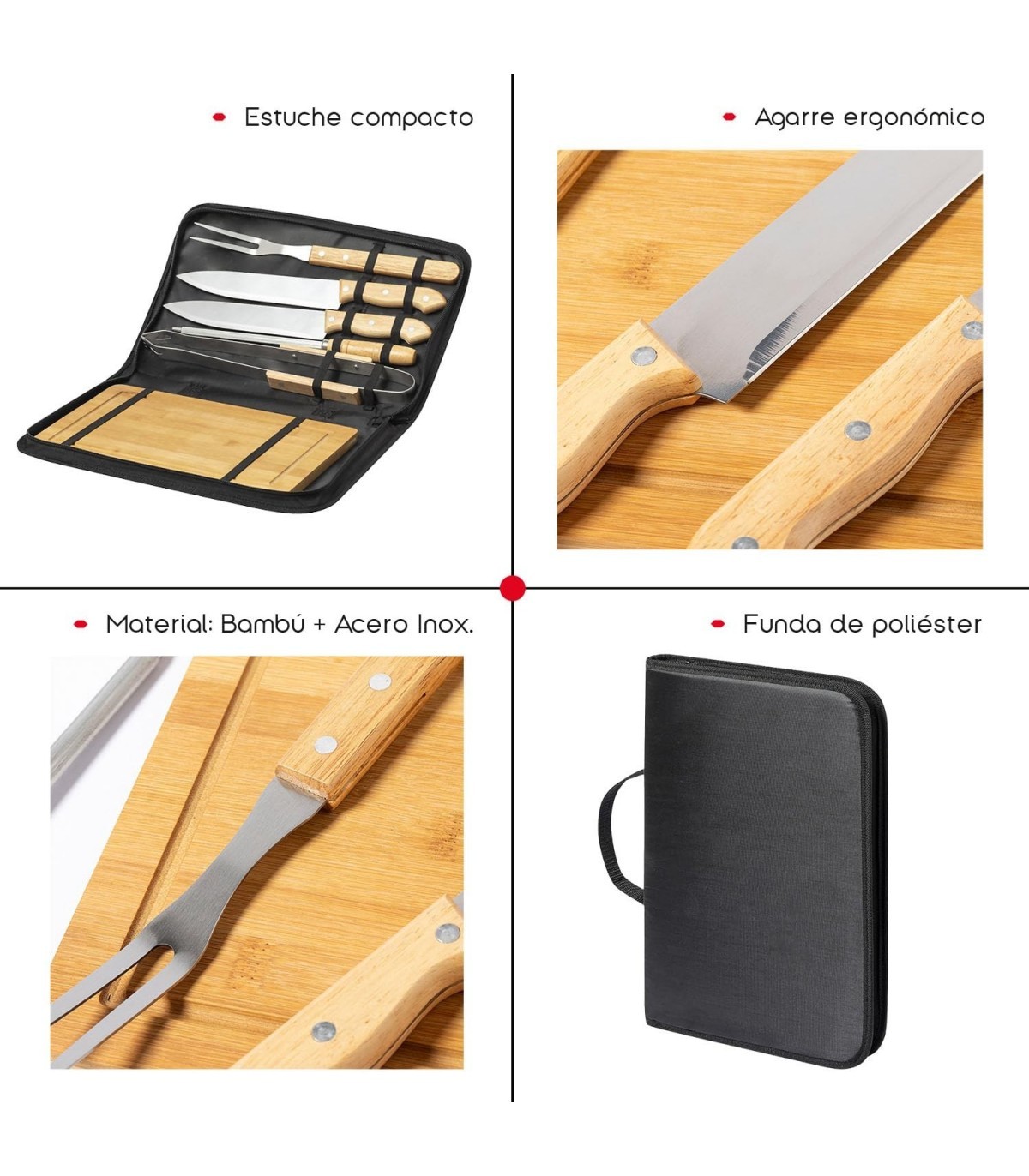 ? VARIEDAD DE OPCIONES: Disponemos de dos sets: uno con cinco utensilios y una tabla de cortar, y otro con acabado de bambú que incluye una paleta, un trinchador y una pinza, ofreciendo opciones para todas tus necesidades de barbacoa.