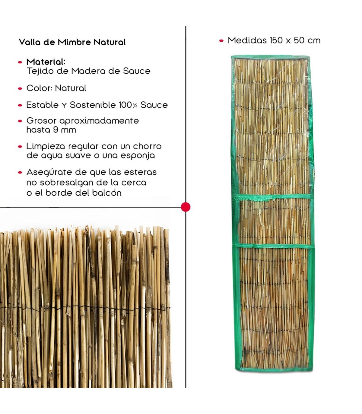 ? MATERIAL NATURAL Y RESISTENTE: La valla está fabricada con madera de sauce, un material duradero y estéticamente agradable que proporciona una apariencia natural perfecta para cualquier espacio exterior.