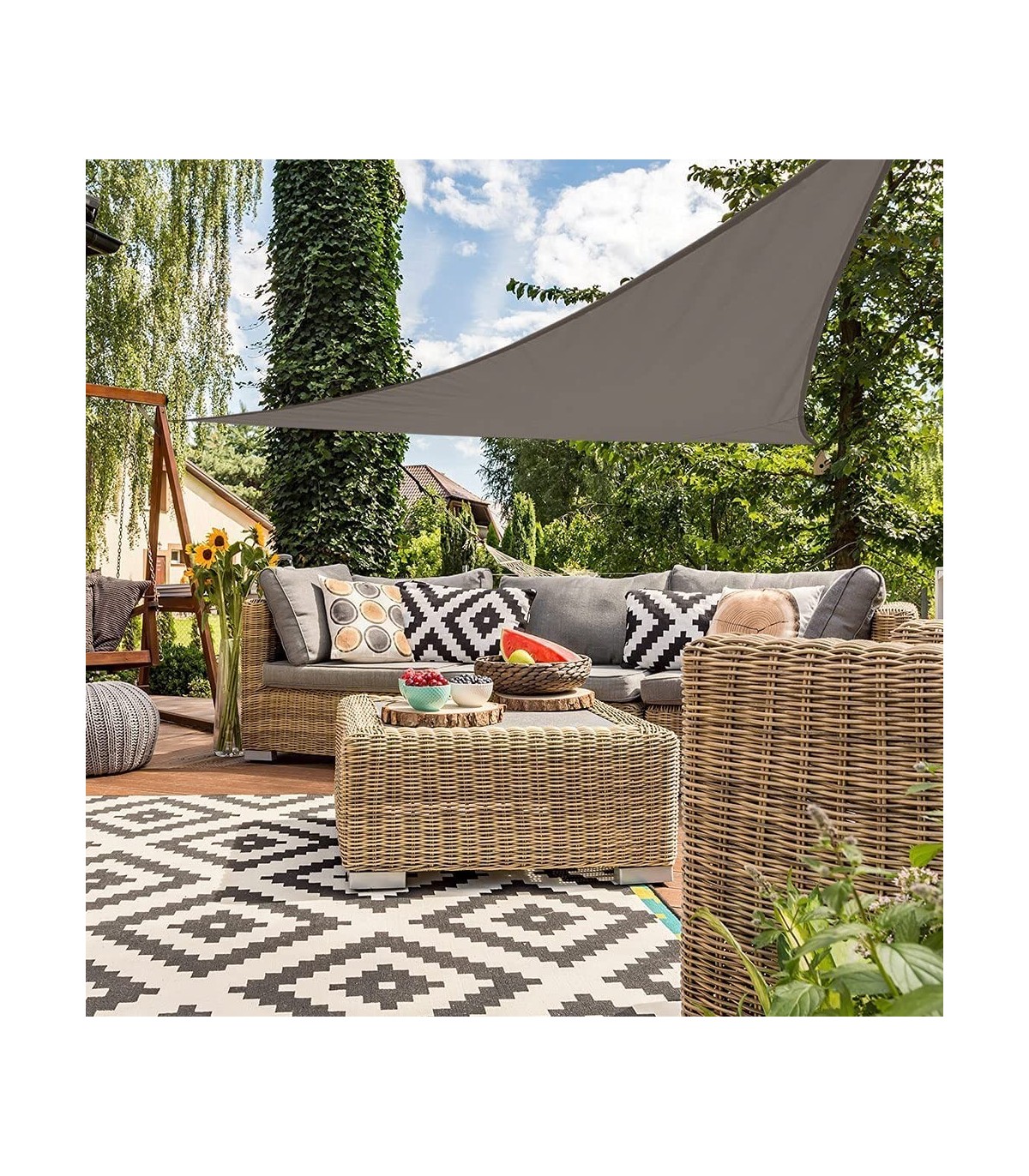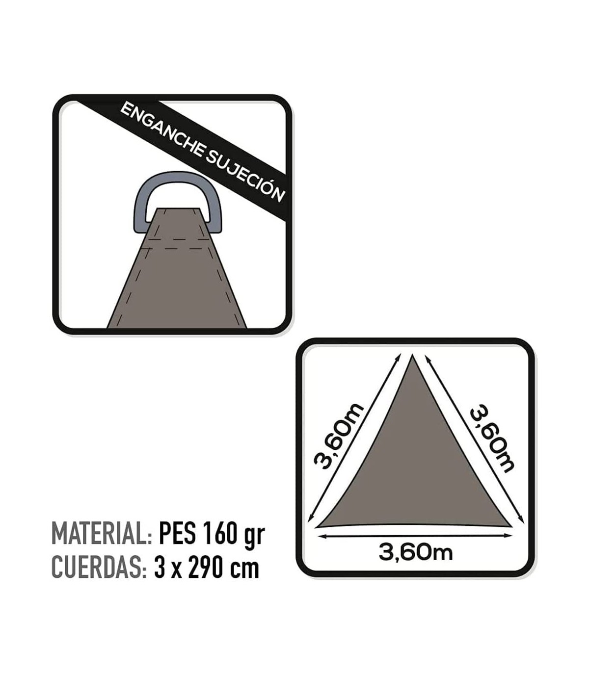 Disfruta del exterior bajo la sombra de nuestro toldo triangular, resistente y fácil de colocar con las anillas y que posee en las esquinas y las cuerdas que incluye para colgar en cualquier rincón.